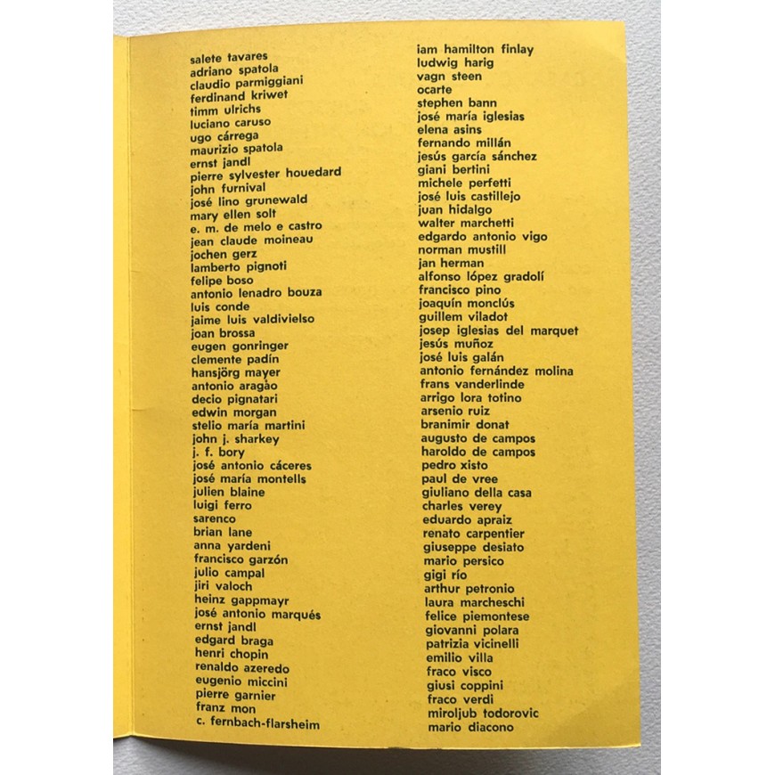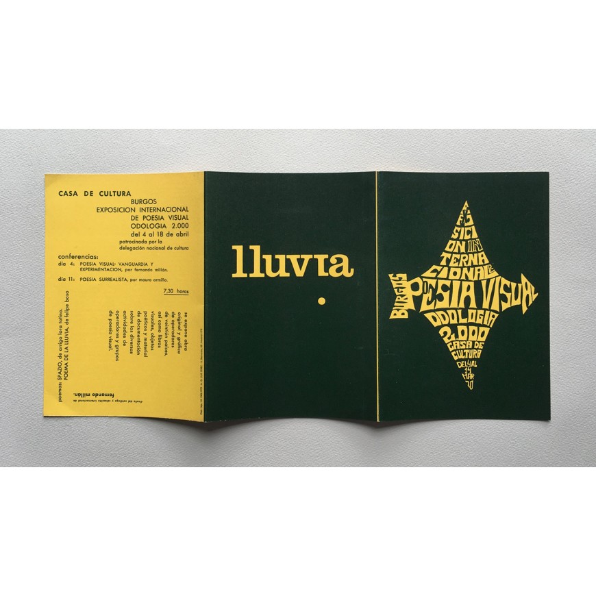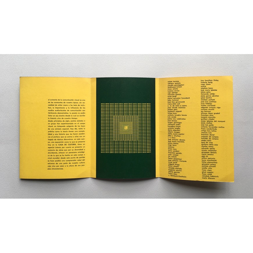 Tríptico de la exposición internacional de poesía visual organizada por los poetas visuales Antonio L. Bouza, Luis Conde y Jaime Luis Valdivielso, integrantes del grupo de poesía experimental Movimiento Odología 2000. Ilustrado con dos poemas visuales de Arrigo Lora Totino y Felipe Boso. El catálogo y la selección de artistas estuvieron a cargo de Fernando Millán. Se presentó obra - obra original, gráfica, libros visuales, objetos poéticos y material de documentación - de creadores de ventiún países, entre ellos, Adriano Spatola, Timm Ulrichs, Ugo Carrega, John Furnival, Jochen Gerz, Felipe Boso, Joan Brossa, Clemente Padín, Hansjörg Mayer, Decio Pignatari, Julien Blaine, Sarenco, Julio Campal, Jiri Valoch, Henri Chopin, Hamilton Finlay, Elena Asins, Fernando Millán, José Luis Castillejo, Juan Hidalgo, Walter Marchetti, Francisco Pino, Arrigo Lora Totino, Augusto y Haroldo de Campos, Paul de Vree y muchos otros. Además se celebraron dos conferencias que estuvieron a cargo de Fernando Millán y Mauro Armiño. Una de las caras de tríptico serigrafiada