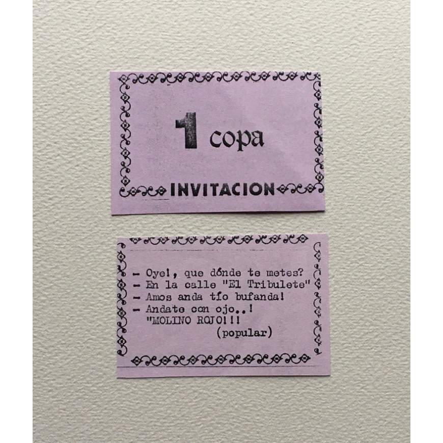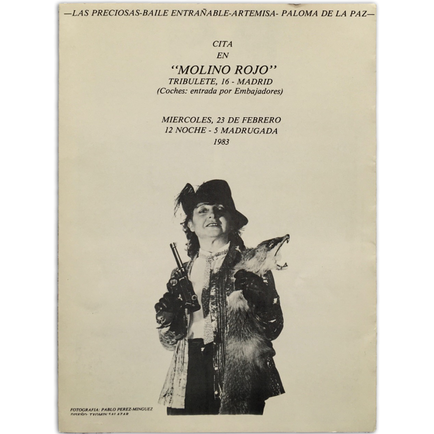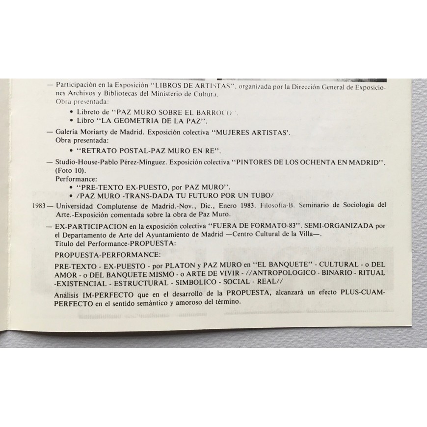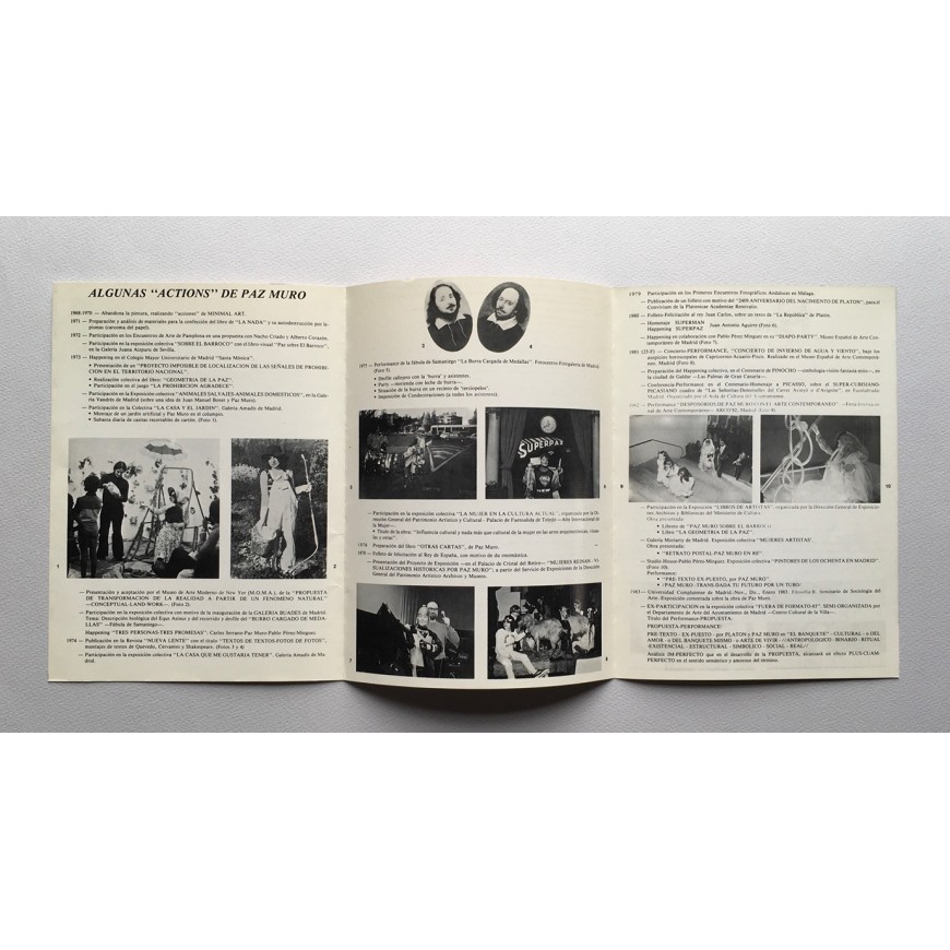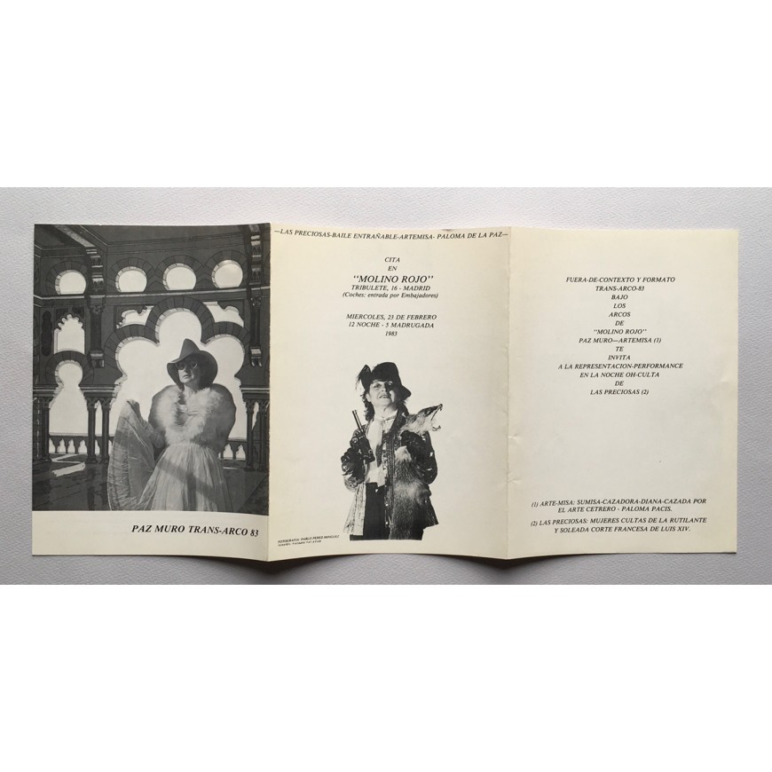 Tríptico-invitación a la performance con fotografías en b/n y relación de algunas "actions" de Paz Muro (1968-1983). Fotografía: Pablo Pérez-Mínguez. Diseño: Txomin Salazar. Se adjuntan dos invitaciones a "1 copa". (Al quedarse fuera de la exposición "Fuera de Formato" - celebrada en 1983 en Madrid y comisariada por Rafael Peñalver, Concha Jerez y Nacho Criado - Paz Muro respondió a esta exclusión con esta performance en el desaparecido Molino Rojo de Lavapiés)