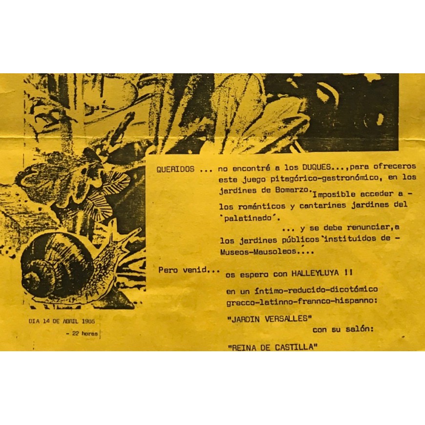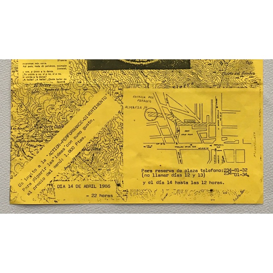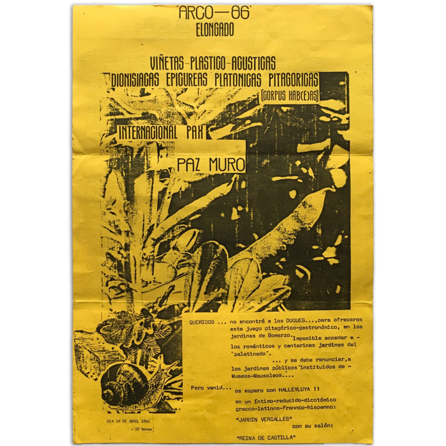 Hoja-invitación a la "action-performance-divertimento" de Paz Muro dedicada a "Arco 86". Impresa por ambas caras