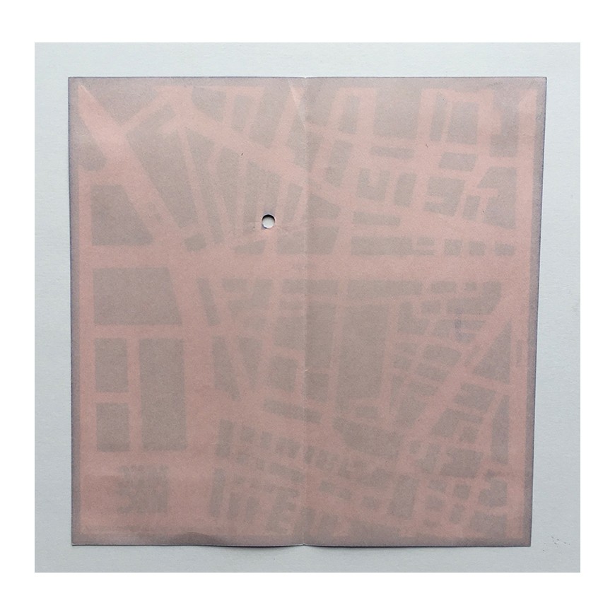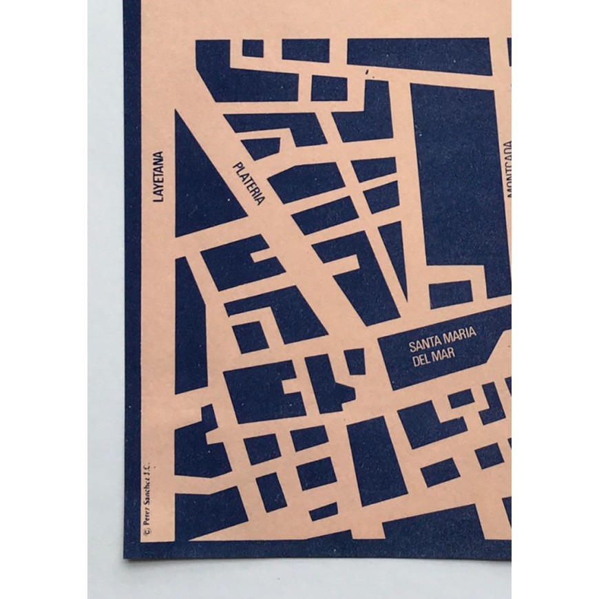 Plano con la ubicación en Barcelona de la Galería Mec-Mec. Hoja suelta plegada en dos. El diseño fue obra del diseñador gráfico America Sanchez