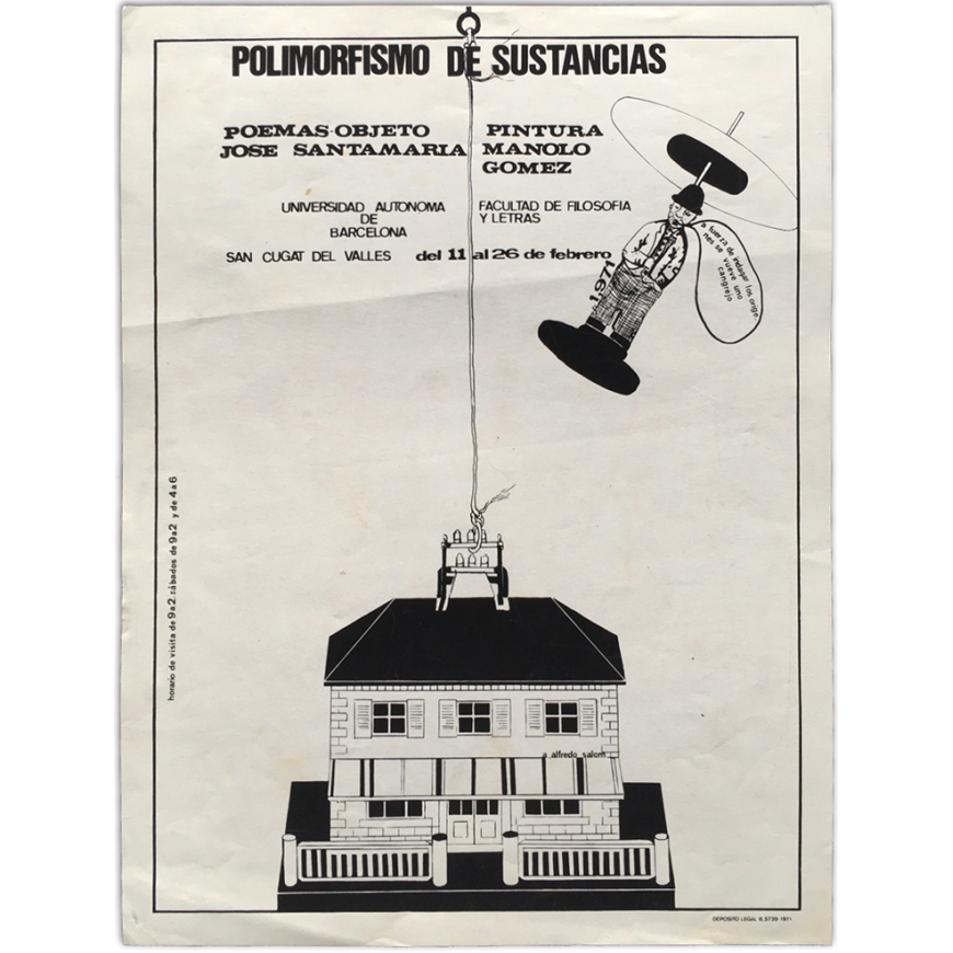 Polimorfismo de sustancias: Poemas objeto José Santamaría - Pintura Manolo Gómez. Universidad Autónoma de Barcelona-Facultad de Filosofía y Letras, San Cugat del Vallés del 11 al 26 de febrero de 1971