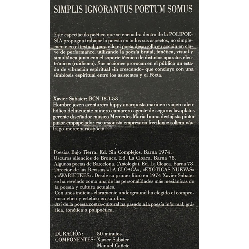 Hoja del espectáculo de performance poética "Simplis poetus ignorantius somus" del grupo "Poliphonética Dinámica". En él se mezclaban poemas fonéticos, poemas más discursivos, voces sampleadas, música experimental e imágenes proyectadas con diapositivas. El espectáculo se movió durante un año por muchas salas de Barcelona, como Zeleste o el teatro Malic, por Terrassa y Sant Boi, e hizo la última actuación en el Círculo de Bellas Artes de Madrid en 1990. Hoja suelta impresa por una cara y plegada