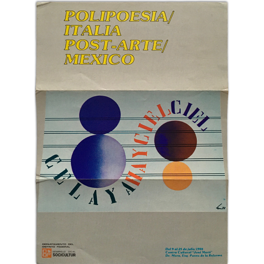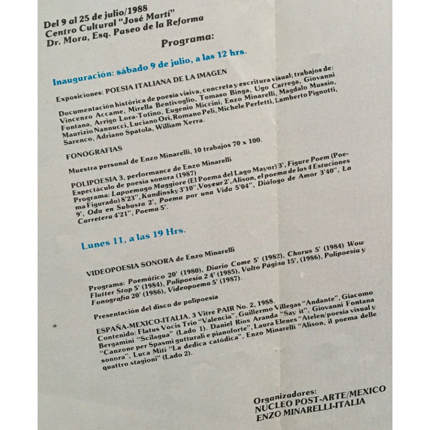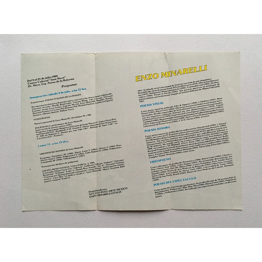 Programa del evento organizado en Ciudad de México por el Núcleo Post-Arte (México) y Enzo Minarelli (Italia). En el programa: exposición "Poesía italiana de la imagen" (Vincenzo Accame, Mirella Bentivoglio, Lora-Totino, Maurizio Nannucci, Sarenco, Adriano Spatola, Giovanni Fontana,...), "Fonografías" de Enzo Minarelli, "Polipoesía 3" (performance de Enzo Minarelli), "Videopoesía Sonora" de Enzo Minarelli, etc. Hoja suelta impresa por ambas caras y plegada en tres