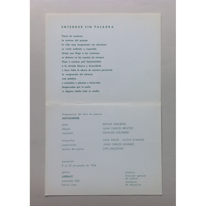 Folleto de la presentación del libro de poemas "Mutaciones". Con texto de Betina Edelberg, dibujos de Juan Carlos Benítez, impresión de Osvaldo Colombo y fotografías de Sara Facio y Alicia d'Amico. La presentación estuvo a cargo de Juan Carlos Ghiano, con lectura de poema por Cipé Lincovsky. Auspiciada por la Dirección General de Cultura