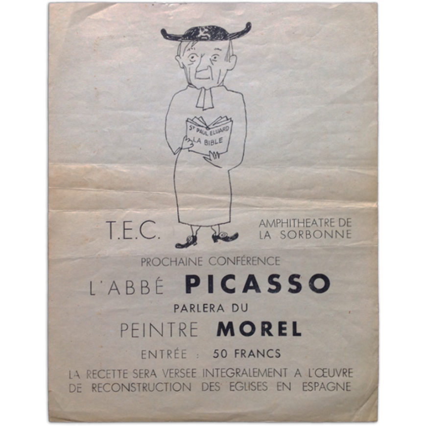 Prochaine conférence, L'abbé Picasso parlera du peintre Morel. Amphitheâtre de La Sorbonne, [Paris], [1946]. La recette sera versee integralement a l'oeuvre de reconstruction des eglises en Espagne