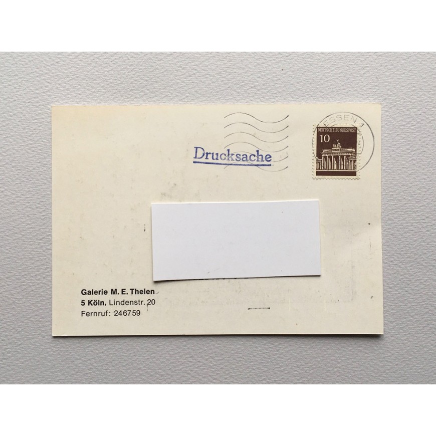 Tarjeta-invitación a la exposición con ilustración fotográfica en b/n. Enviada por correo postal - a otra galería - y matasellada