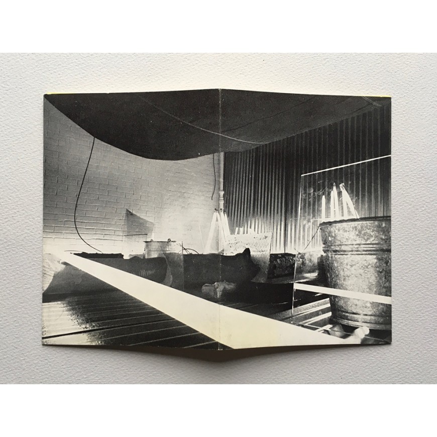 Invitación a la exposición, compuesta por una cubierta ilustrada con una fotografía en b/n que contiene una tarjeta amarilla con los datos de la muestra en su interior. Plegada en dos