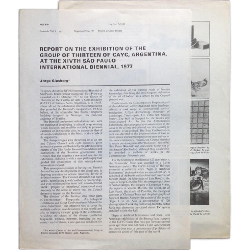 Report on the exhibition of the Group of Thirteen of CAyC, Argentina, at the XIVth Sao Paulo International Biennial, 1977. Jorge Glusberg (Leonardo, Vol. 1 , pp. - Pergamon Press 197 - Printed in Great Britain)