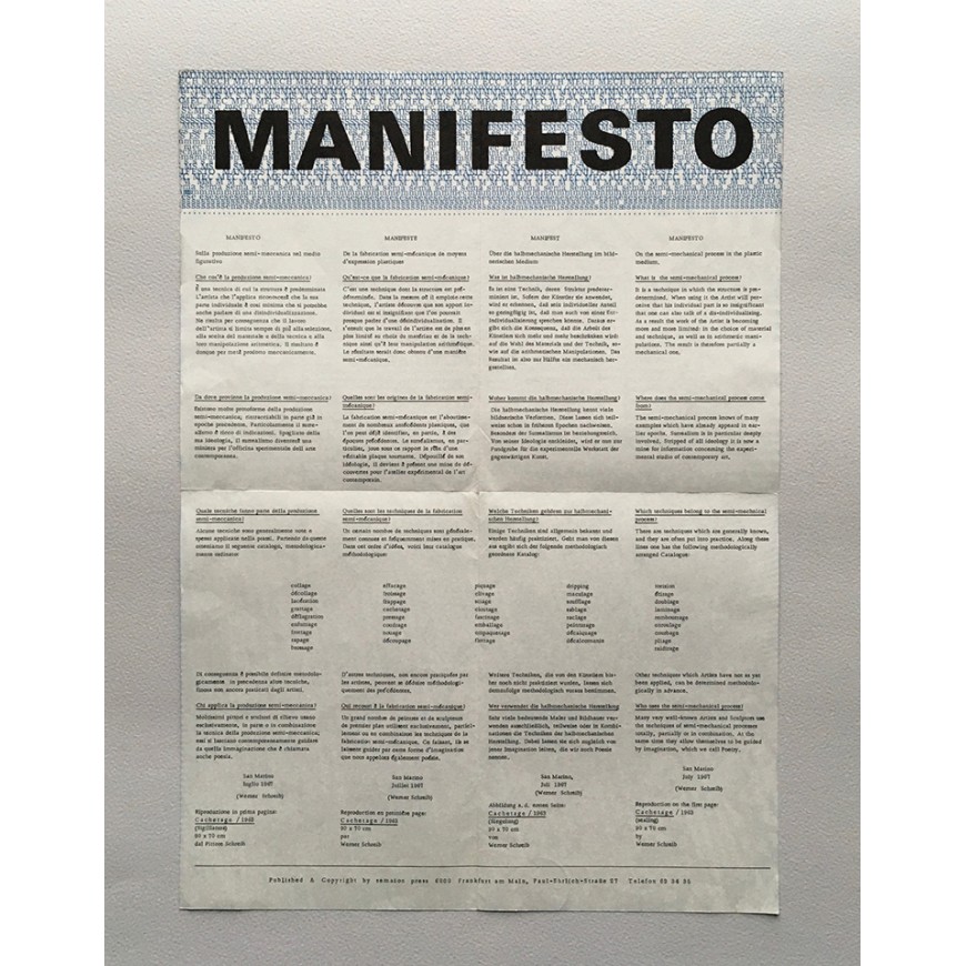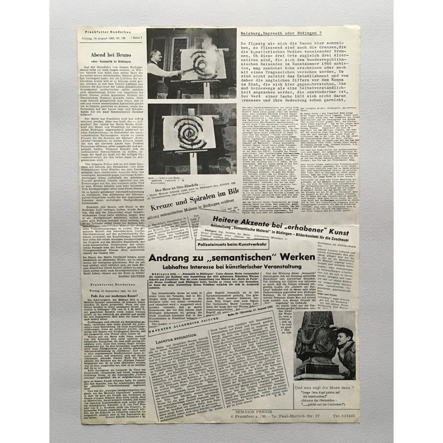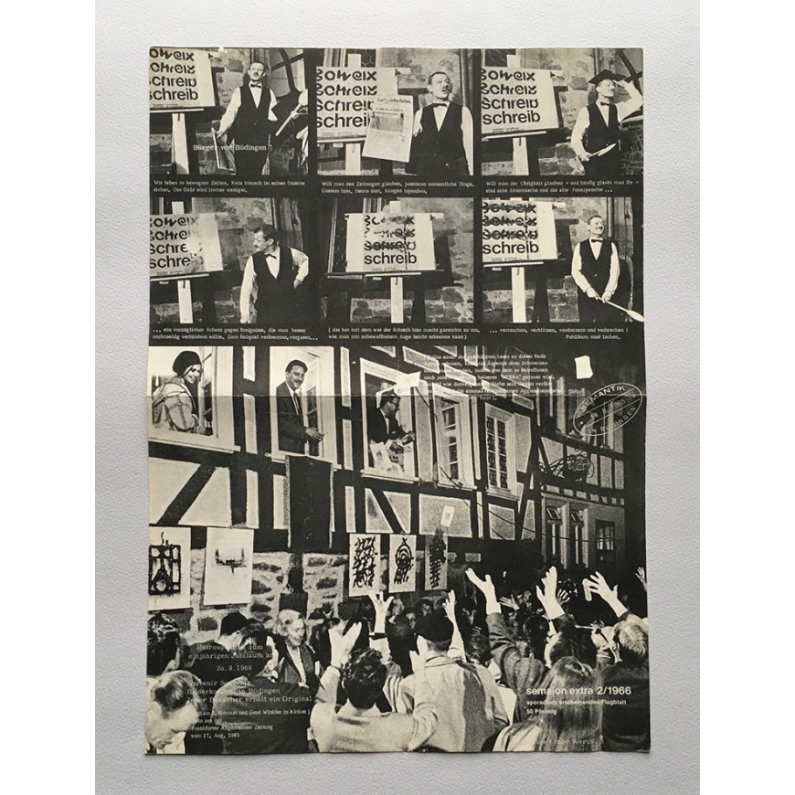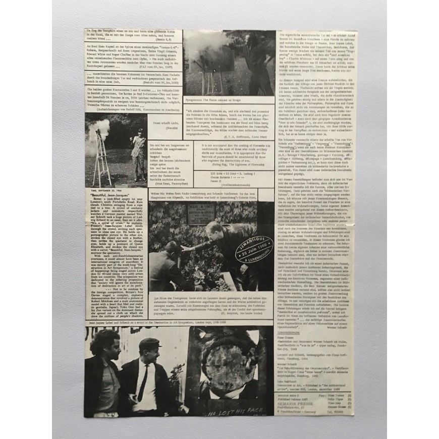 Tres números de la publicación de arte experimental. Con formato de hoja plegada en dos e impresa por ambas caras. Fotos: Inge Werth, Horst Turner, Felix Thyes, Theo Mey, Hannes Grosse. Textos de Hanno Reuther y Werner Schreib. En alemán. El número 4 con el texto "Manifesto" de Werner Schreib en italiano, francés, alemán e inglés