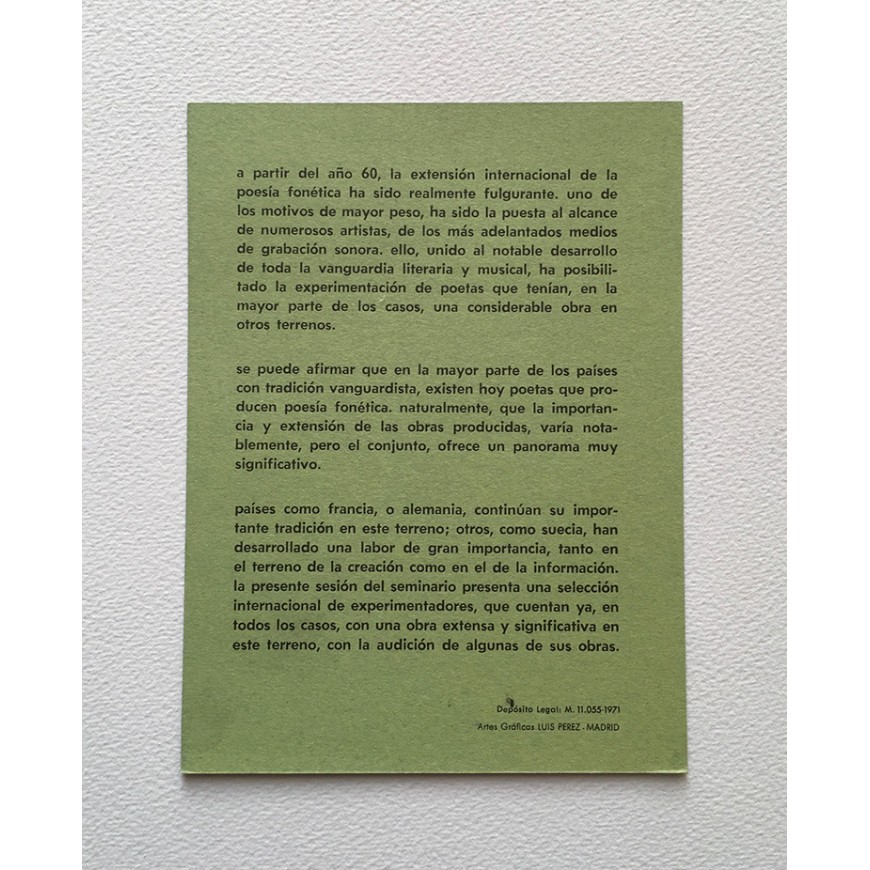 Seminario de Poesía Fonética. 4ª sesión: Extensión internacional de la Poesía Fonética I. Ponente: Fernando Millán. Realización: Equipo n. o. Audiciones: Petronio, de Vree, Hodell, Pierre e Ilse Garnier, Bodín. Sala Instituto Francés, [Madrid], 28 de mayo 1971