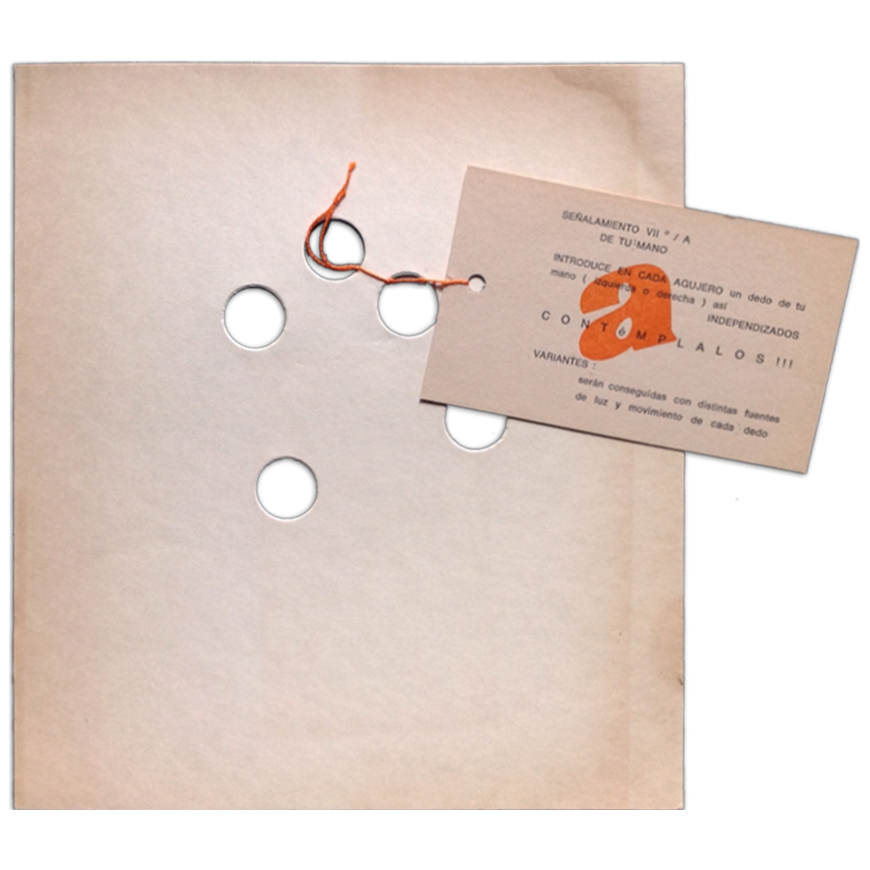 Cartón con cinco perforaciones circulares y una tarjeta con instrucciones; unidas por un cordón. Trabajo incluido en el nº 2 "ab" de la revista Hexágono '71 (La Plata, 1971-1975). Leve marca de humedad en borde, por lo demás buen estado