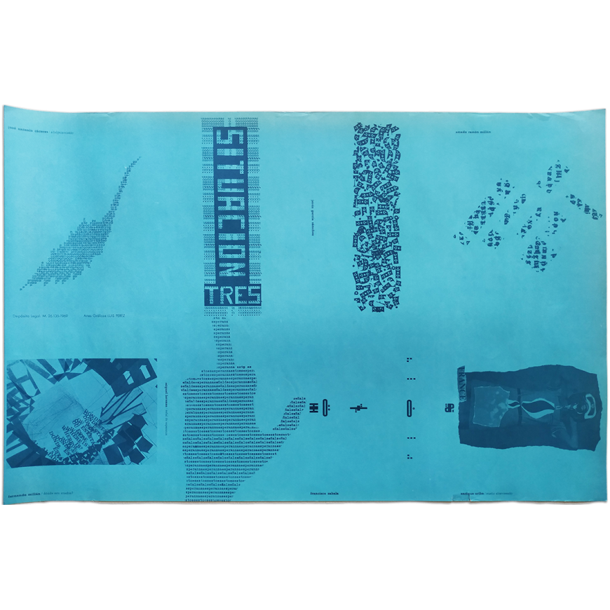 Cartel con poemas visuales de José Antonio Cáceres, Miguel Lorenzo, Enrique Uribe, Francisco Zabala, Amado Ramón Millán, Fernando Millán y Jesús Gárcía Sánchez, integrantes del "Grupo N.O". Dos pequeñas roturas en borde, por lo demás buen estado