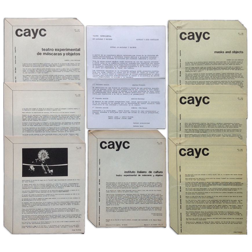 Muestra organizada por el Centro de Arte y Comunicación de Buenos Aires (CAyC). En total 7 gacetillas informativas del CAyC: Instituto Italiano de Cultura. Teatro experimental de máscaras y objetos. Una hoja con texto de Alfredo y Luis Portillos (gacetilla 654; 19-8-76); Teatro experimental de máscaras y objetos. 3 hojas con texto de Jorge Glusberg (gacetillas 657, 658, 659; 24-8-76); Masks and objects, 3 gacetilas con el mismo texto en inglés (gacetillas 680, 681, 682; 2-11-76)