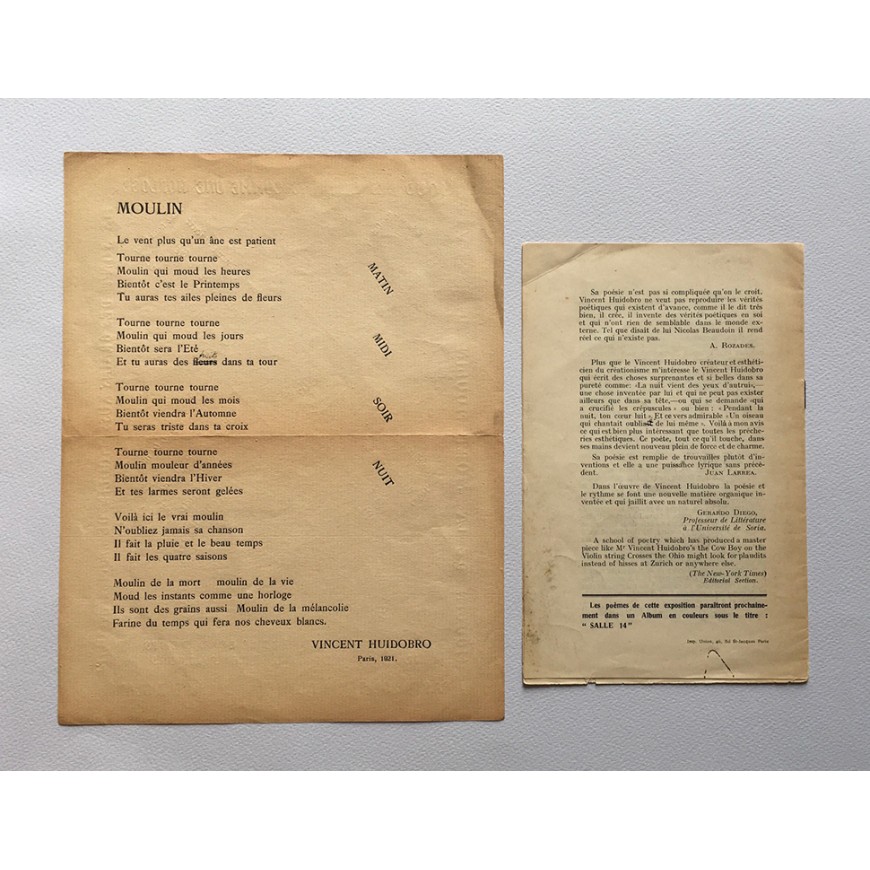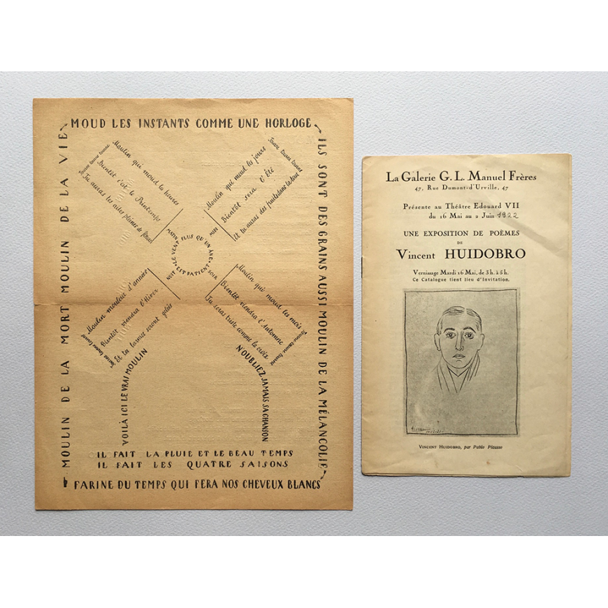 Présente au Théâtre Edouard VII du 16 Mai au 2 Juin 1922 (el año escrito a lápiz). Catálogo-Invitación + el caligrama "Moulin" que acompañaba a éste. El catálogo con textos de Maurice Raynal, Waldemar George, T. Peiper, Serge Romoff, Juan Larrea, Gerardo Diego y otros. Retrato de Huidobro por Picasso en la portada. Caligrama en hoja suelta: poema en tipografía normal impreso en el reverso con una corrección a tinta de Huidobro (tacha la palabra "fleurs" y la sustituye por "fruits")