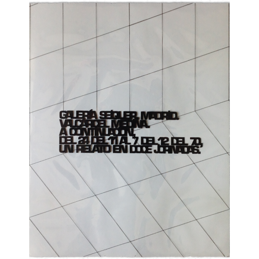 Cartel de la exposición A Continuación. Un relato en doce jornadas: lugares, sonidos, palabras, Galería Seiquer, Madrid, del 24 del 11 al 7 del 12 de 1970. En acetato transparente impreso en negro. Se adjunta el programa con la descripción de las doce jornadas (pliego de 4 hojas impreso por ambas caras). Instalación performativa en la que Valcárcel Medina integra por primera vez elementos sonoros