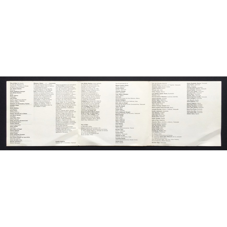 "Viva el color", 36 minutos. Un film del Ministerio de Información y Turismo y del Museo de Bellas Artes de Caracas. Dirección: Luis Alfredo Sánchez. Guión: Carlos Maldonado Bourgoin y Luis Alfredo Sánchez. El proyecto surgió a raíz del Primer Encuentro Iberoamericano de Críticos de Arte y Artistas Plásticos, realizado en Caracas con motivo de la celebración de los 40 años de la apertura del Museo de Bellas Artes, y contó con la participación de artistas y críticos como Alejandro Obregón, Juan Acha, Antonio Saura, Rafael Canogar, Julio Le Parc, Juan Genovés, Roberto Montero Castro, Mariano Rodríguez, Sofía Imbert de Rangel, Gastón Diehl y otros