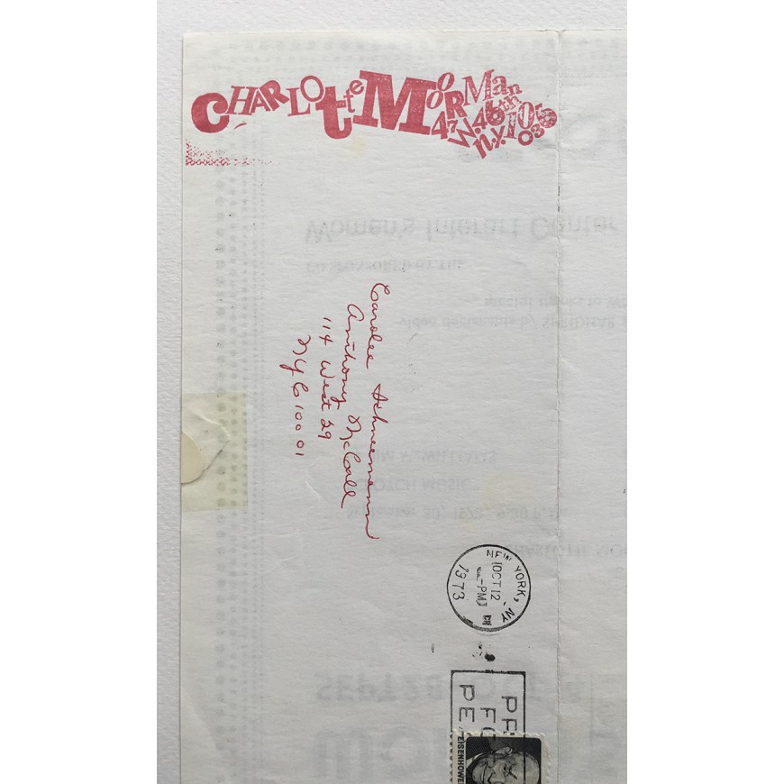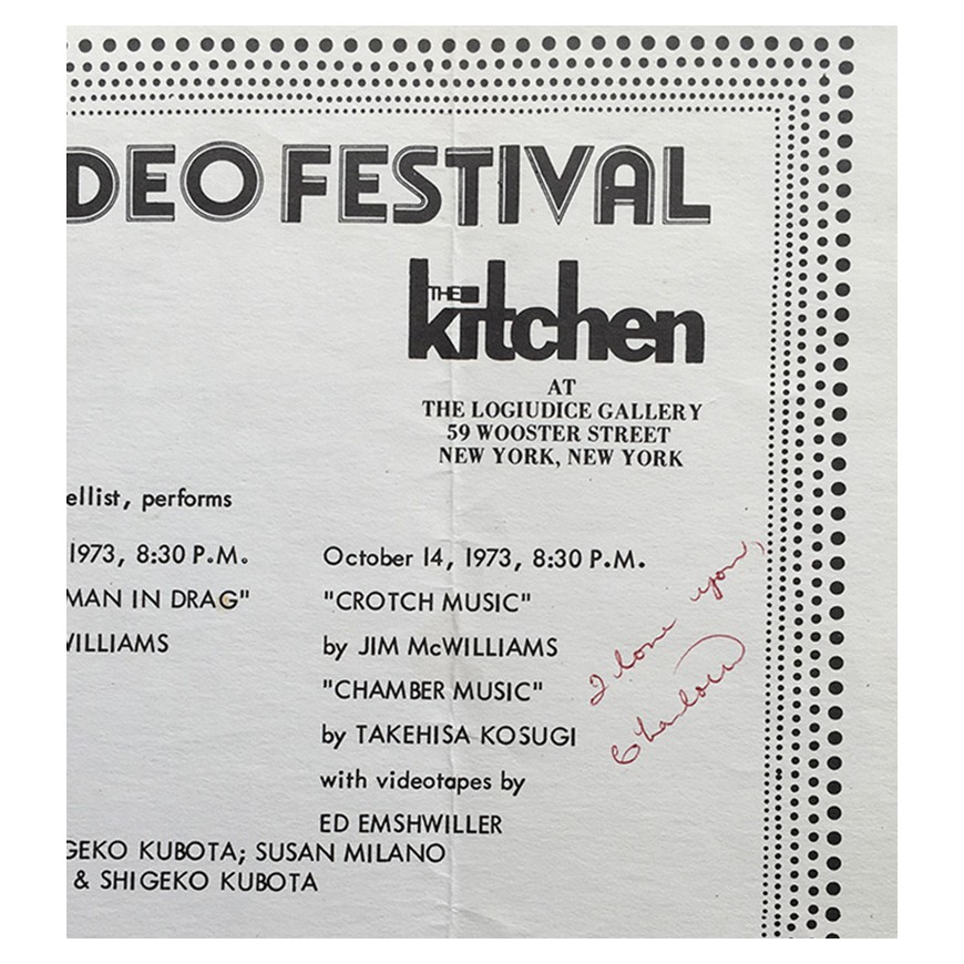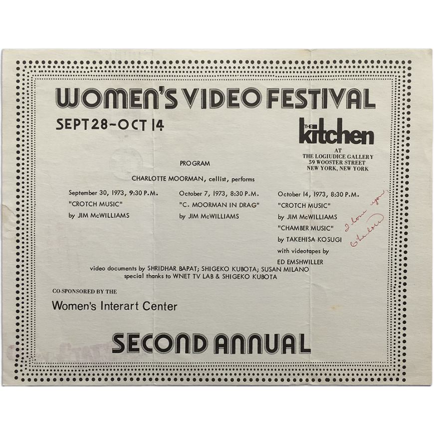 Pequeño cartel con el programa del festival, publicado con motivo del segundo Women's Video Festival celebrado en la Logiudice Gallery de Nueva York entre septiembre y octubre de 1973. Contó con el apoyo de The Kitchen y el Women's Interart Center. Manuscrito por Charlotte Moorman y con su sello: el cartel fue plegado en tres y enviado por correo por Moormann a la artista estadounidense Carolee Schneemann
