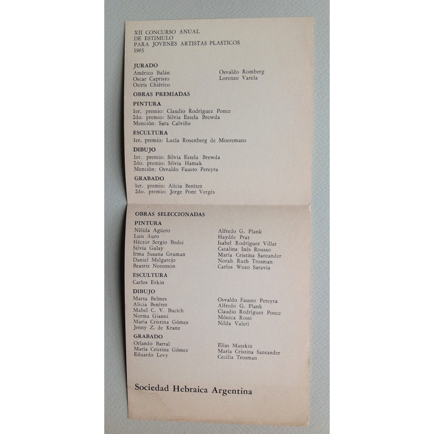 XII Concurso Anual de Estímulo para Jóvenes Artistas Plásticos 1965. (Pintura, Escultura, Dibujo, Grabado). Jurado: Américo Balán, Oscar Capristo, Osiris Chiérico, Osvalgo Romberg y Lorenzo Varela. Entre los premiados: C. Rodríguez Ponce, Lucía Rosenberg, Silvia Estela Brewda y Alicia Benítez