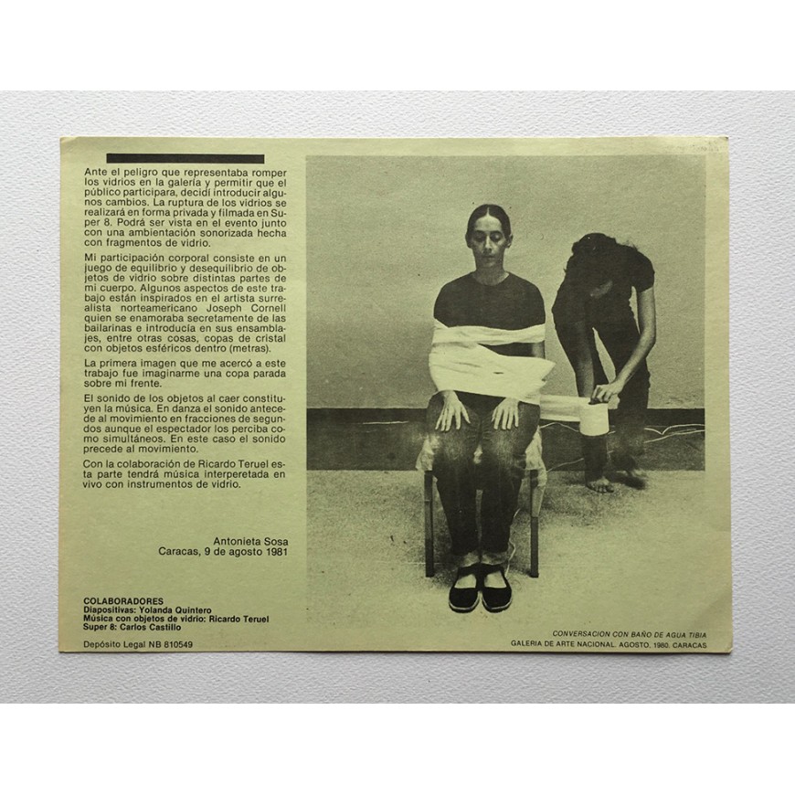 Hoja de sala con texto de la propia artista explicando la acción. Colaboraron en la misma: Yolanda Quintero (diapositivas), Ricardo Teruel (música con objetos de vidrio) y Carlos Castillo (Super 8). Ilustrada con una fotografía de la acción Conversación con baño de agua tibia (Galería de Arte Nacional, Caracas, agosto 1980). Tarjeta en cartulina impresa por ambas caras