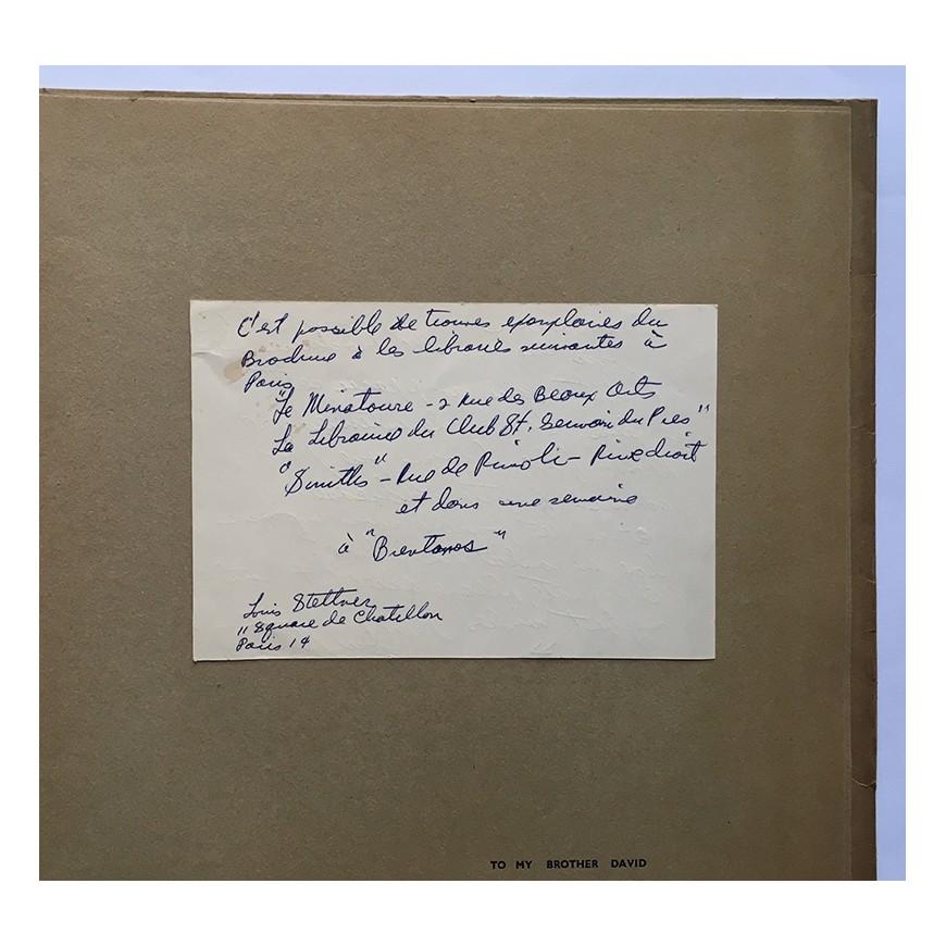 Adjunta hoja suelta con nota manuscrita de Stettner dirigida a Maurice Nadeau en la que le anuncia la inminente aparición de la publicación y le indica en que librerías de París podrá encontrarse. La hoja está manuscrita por ambas caras y firmada por Louis Stettner en París en 1948