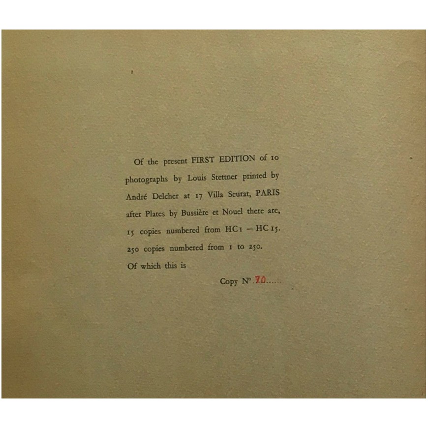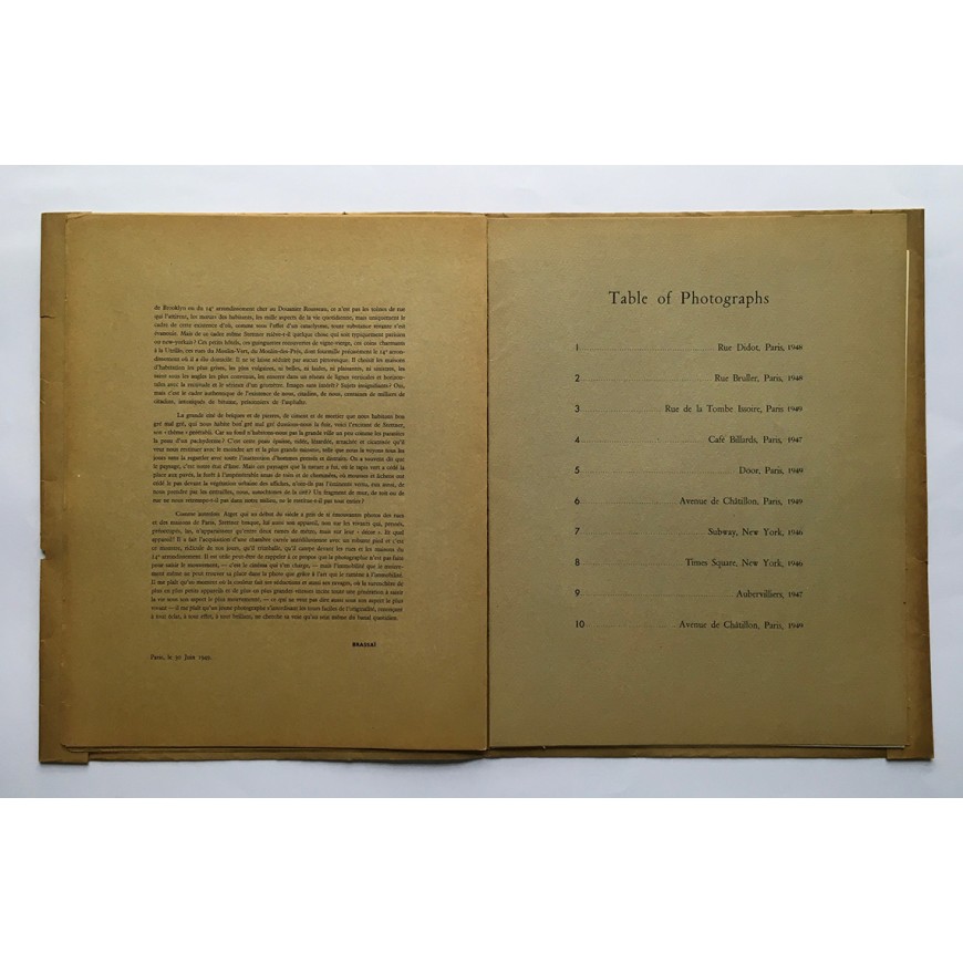 Uno de los 265 ejemplares publicados, éste el ejemplar nº 70 numerado a mano. Introducción de Brassaï con traducción al inglés. Con 10 reproducciones en b/n de las fotografías en láminas sueltas numeradas. Cubiertas originales levemente oscurecidas y con una pequeña pérdida y una pequeña rotura en los bordes, por lo demás buen ejemplar
