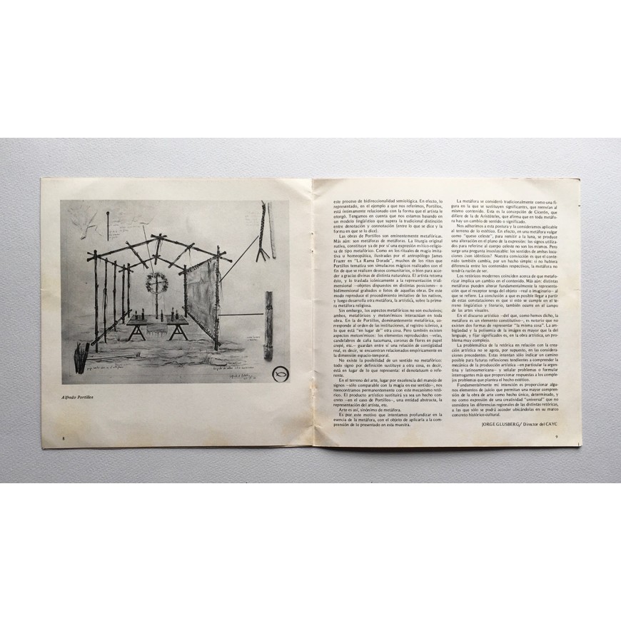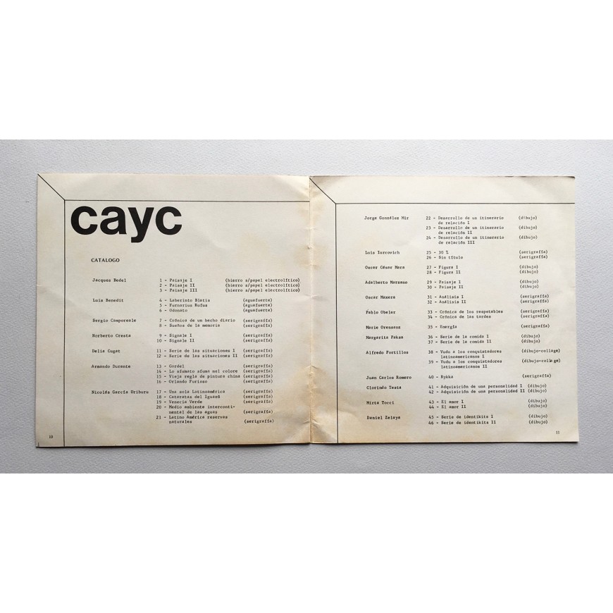Catálogo de la exposición presentada por el Grupo CAyC - Centro de Arte y Comunicación de Buenos Aires - en Lima y en la que participaron Nicolás García Uriburu, Óscar César Mara, Juan Carlos Romero, Clorindo Testa, Alfredo Portillos, Daniel Zelaya, Luis Yurcovich, Jacques Bedel, Luis Benedit, Sergio Camporeale, Norberto Cresta, Delia Cugat y otros. Con ilustraciones en b/n y texto de Jorge Glusberg