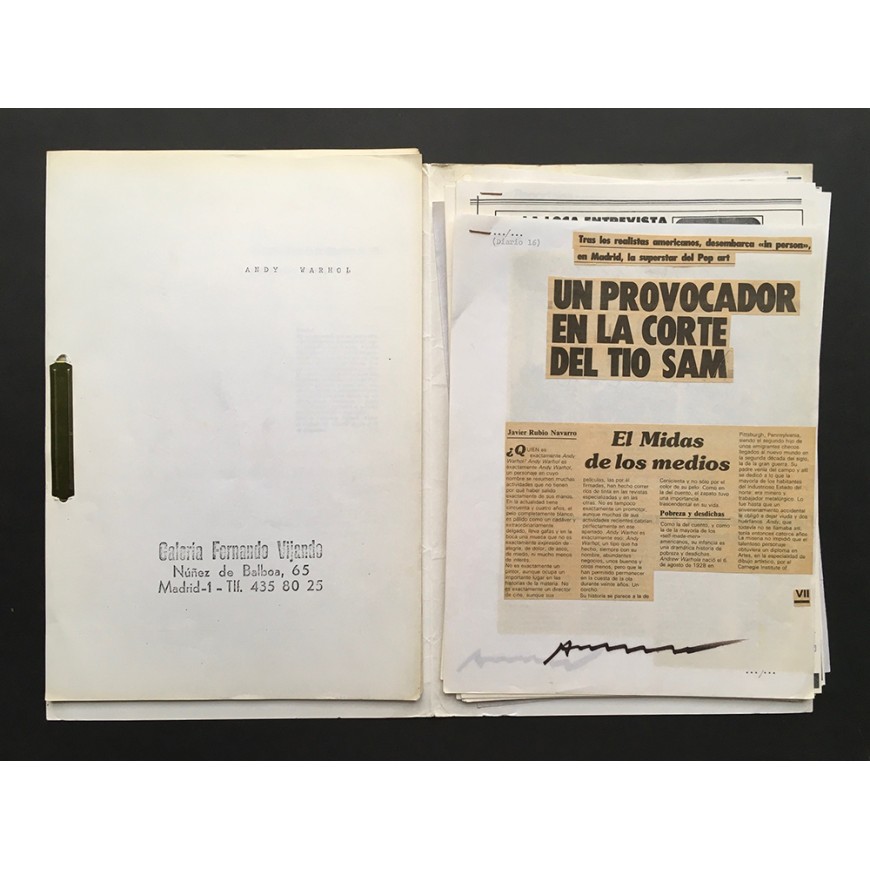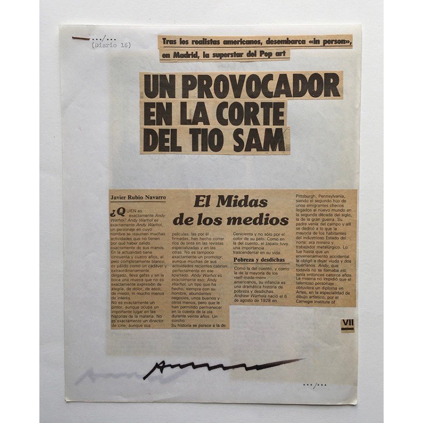 Además adjunta recortes del artículo de Javier Rubio Navarro en Diario 16 ("Un provocador en la Corte del Tío Sam"). Los recortes pegados sobre dos folios blancos y ambas hojas con la firma manuscrita a rotulador por Andy Warhol al pie