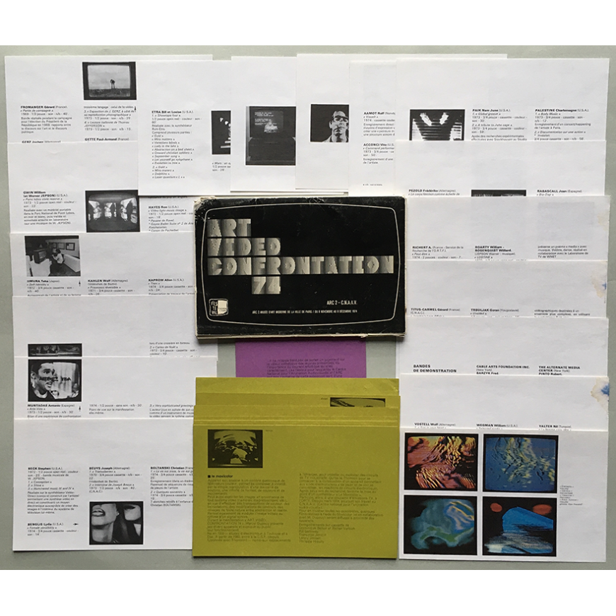 Catálogo de la exposición organizada por A.R.C. 2 y el C.N.A.A.V. (Centre National pour l'Animation Audio-Visuelle). Compuesto por un díptico con prefacio de Michel Fansten + 27 hojas sueltas impresas por ambas caras con la lista de videoartistas internacionales y textos de Suzanne Pagé, Dominique Belloir, Dany Bloch, Claudine Eizykman, Yann Pavie y Donald A. Foresta (en francés). Ilustraciones en color y b/n. Primera confrontación internacional dedicada en Francia al videoarte. En la lista de videoartistas Acconci, Agam, Baldessari, Beuys, Boltanski, Gerz, Dan Graham, Richard Hamilton, Kaprow, Kounellis, Robert Morris, Antoni Muntadas, Nam June Paik, Joan Rabascall, Richard Serra, Bill Viola, Wolf Vostell y muchos otros. En carpeta original impresa con algunas rozaduras y pérdidas en bordes