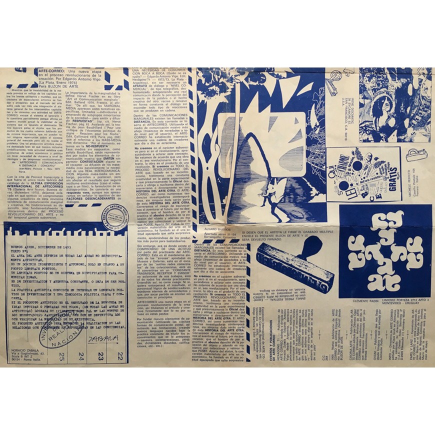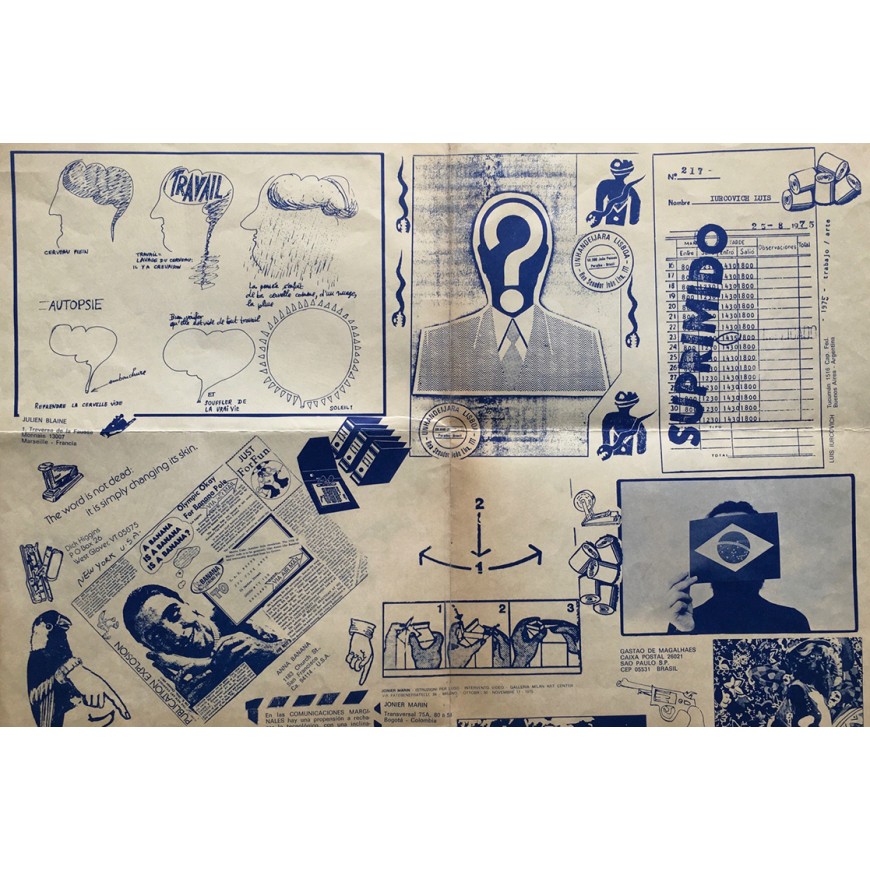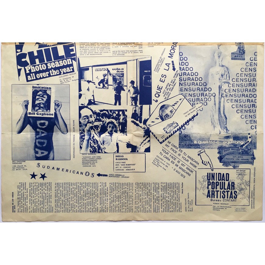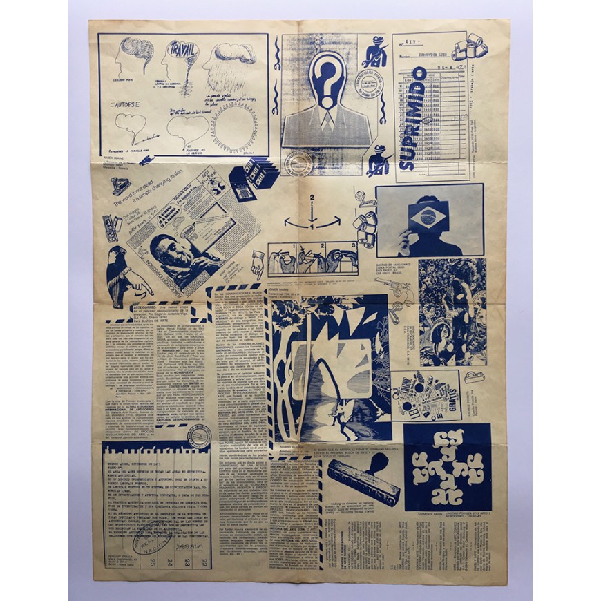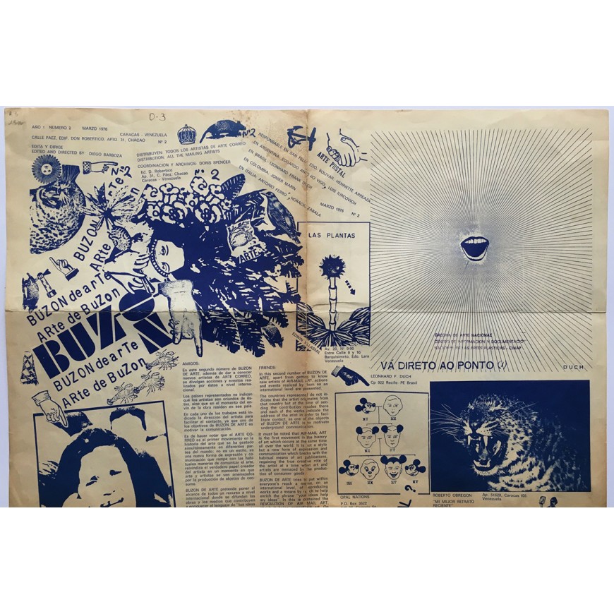 Segundo y último número de la publicación de mail art internacional editada y dirigida por Diego Barboza. Coordinación y archivos: Doris Spencer. Pliego de 8 hojas impreso por ambas caras, con colaboraciones de Leonhard Frank Duch, Roberto Obregón, Edwin Villasmil, Clemente Padín, Opan Nations, Guillermo Deisler, Bill Gaglione, Jorge Caraballo, Luis García, Paulo Bruscky, Edgardo-Antonio Vigo, Robert Rehfeldt, Julien Blaine, Jonier Marín, Álvaro Barrios, Luis Iurcovich, Horacio Zabala, Anna Banana, Dick Higgins, Gastao de Magalhaes, Irene Dogmatic, Galería Milan Art Center y Michelle Perfetti. La publicación incluye tres textos: la presentación editorial, un texto con el título "Higiene de las obras de arte" de Hervé Fischer y el artículo "Arte-correo: una nueva etapa en el proceso revolucionario de la creación" de Edgardo-Antonio Vigo. Pequeña anotación a bolígrafo en margen superior, por lo demás buen estado (las marcas de doblez han sido restauradas en algunos puntos). Edición bilingüe español-inglés. Raro