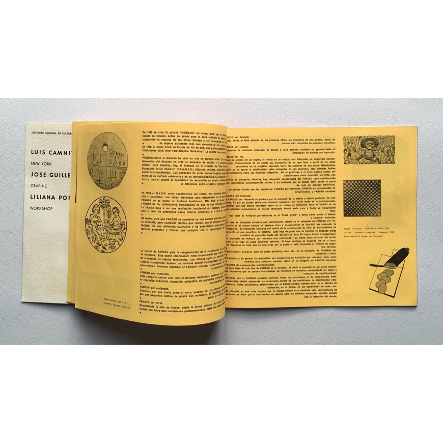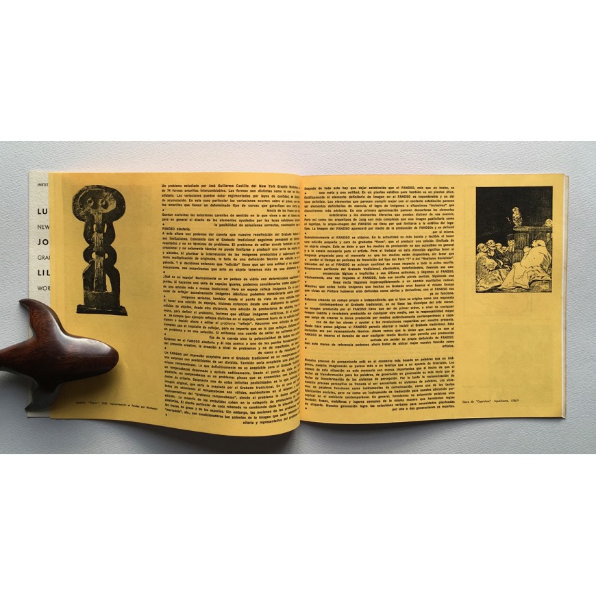Catálogo de la exposición. Introducción: Donald H. Karshan (Presidente del Museo de Artes Gráficas de Nueva York). Organización del catálogo: Gerd Leufert. Diseño catátula: José Guillermo Castillo. Cubiertas ilustradas con el emblema del New York Graphic Workshop. Ilustraciones en negro y hojas en papel de diferentes colores