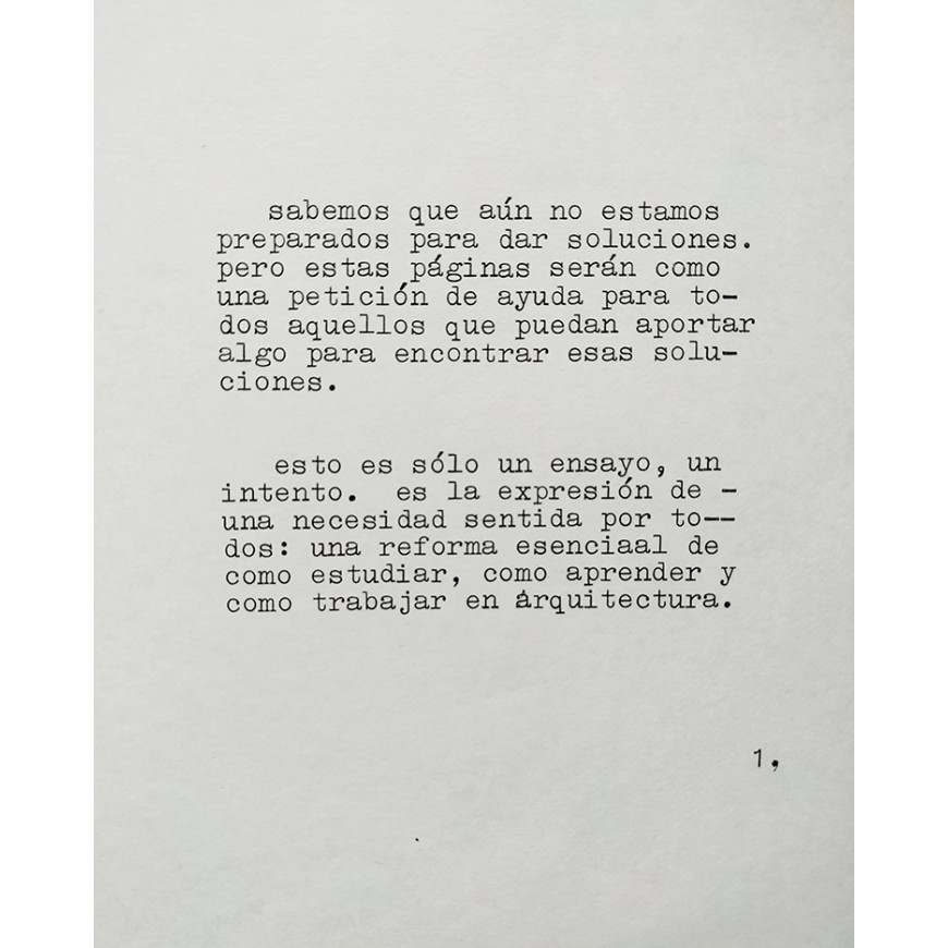 Esto es sólo un ensayo, un intento. Es la expresión de una necesidad sentida por todos: una reforma esencial de como estudiar, como aprender y como trabajar en arquitectura"