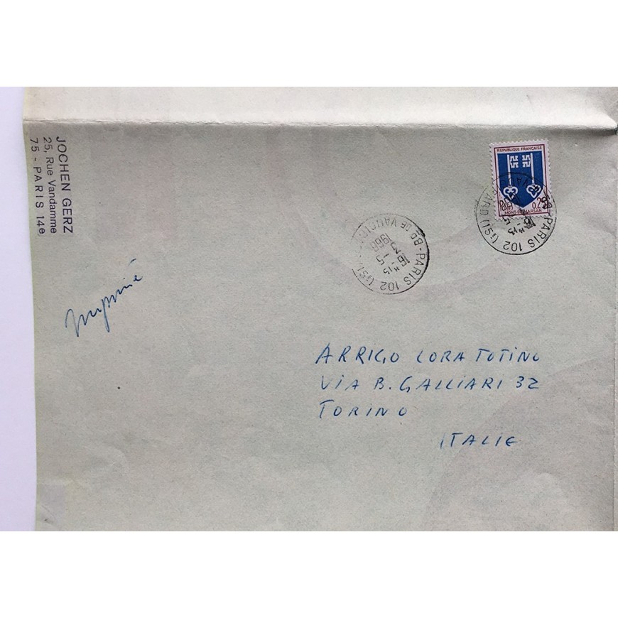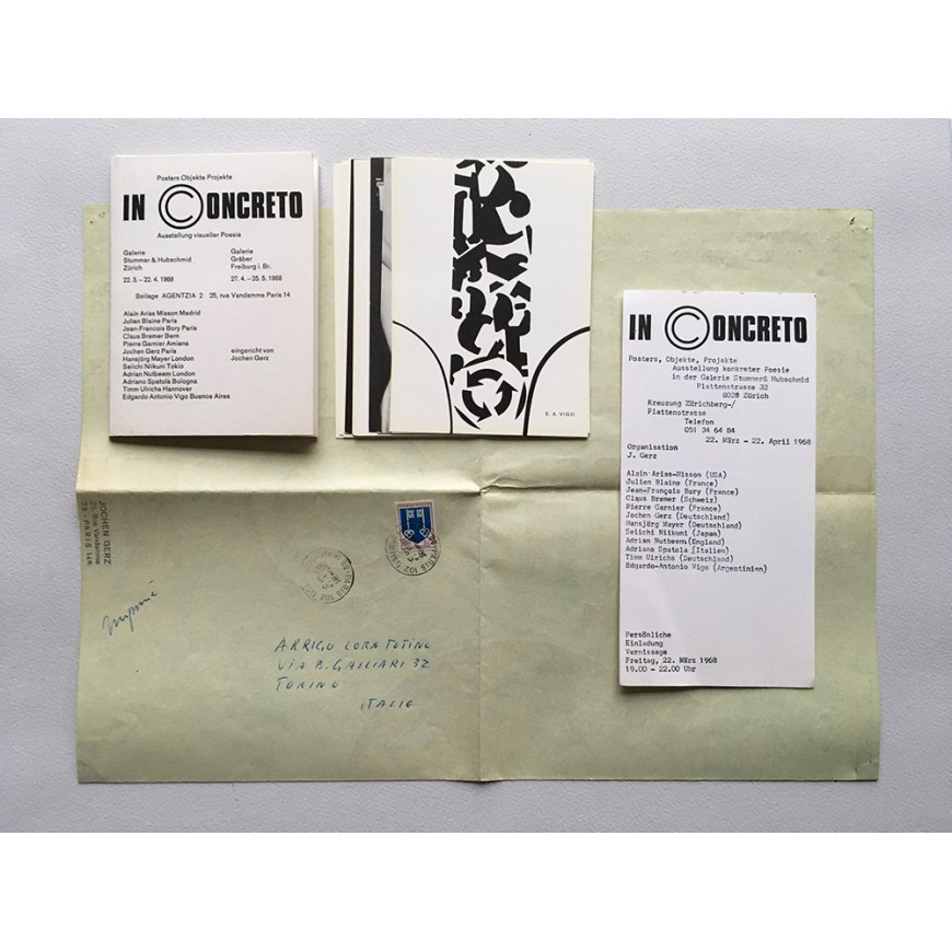 Se adjuntan tarjeta-invitación a la muestra en Zurich + cartel de la muestra en Friburgo (In Concreto. Internationale Ausstellung konkreter Posters Projekte Objekte in der Galerie Gräber, Freiburg, 27 April bis 25 Mai 1968). Este último plegado en ocho y enviado por Jochen Gerz al poeta sonoro y visual italiano Arrigo Lora-Totino. Sello postal y matasellos. Con agujeritos de chincheta en las cuatro esquinas, por lo demás buen estado