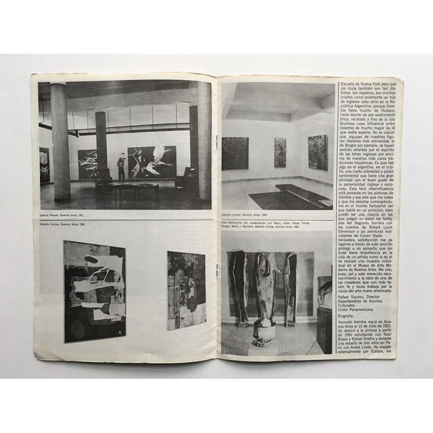 Catálogo de la primera exposición retrospectiva dedicada a Kenneth Kemble. Cubierta y diagramación: Edgardo Giménez. Fotos: Makarius, Jorge Roiger, C. Paganini y Eduardo Colombo. Texto de Rafael Squirru, director del museo