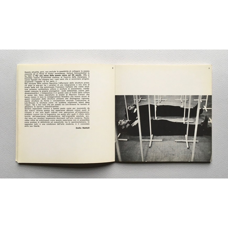 Catálogo de la exposición en la que se presentaron obras (poesía experimental, films, música electrónica,...) de Gianfranco Baruchello, E. M. De Melo e Castro, Piero Fogliati, Ettore Innocente, Teodosio Magnoni, Takahashi Shohachiro, Gerald Rocher, Edgardo Antonio Vigo, Stelio Maria Martini, Fernando Millán, Maurizio Nannucci, Corrado Costa, Martino Oberto, Anna Oberto, Alain Arias Misson, Herman De Vries, Piero Bargellini, Nicola Carrino, Pasquale Santoro, Julien Blaine, Pierre Garnier, Seiichi Niikuni, Getulio Alviani, Jurgen Claus, Ernst Jandl, Shimizu Toshihiko, Enrico Bugli, Mathias Goeritz, Jirí Kolár, Vincenzo Agnetti, Claudio Parmiggiani, Giuliano Della Casa, Adriano Malavasi, Carlo Cremaschi, Adriano Spatola, Auro Lecci, Lanfranco Baldi, Anastasia Bitzos, Jean François Bory, Jochen Gerz, Emilio Villa, Mario Diacono, Franco Vaccari, Antonino Titone, Jiri Valoch, Heinz Gappmayr, Konrad Balder Schaüffelen, Arrigo Lora Totino, Luciano Caruso, Carlo Belloli, Eliseo Mattiacci, Hansjörg Mayer, Claus Bremer, Carl Fernbach Flarsheim, Ludwig Harig, Renato Mambor, Ladislav Novák, Rinaldo Ruzzolese, Maurizio Spatola, Gianni Piacentino, Bora Cosic, Ben Vautier, Giordano Falzoni, Paolo Masi, Franz Mon, Bilyana Tomic, Sandro de Alexandris, Gaetano Pesce, John Furnival, Slodoban Masic, Dragos Kalajic-Drago, Milenko Matanovic, Renato Carpentieri, Franco Visco, Craia, Cegna y Monasechi. Ilustraciones en b/n. Textos de Emilio Mattioli, Anastasia Bitzos, J. F. Bory y Giordano Falzoni (en italiano)