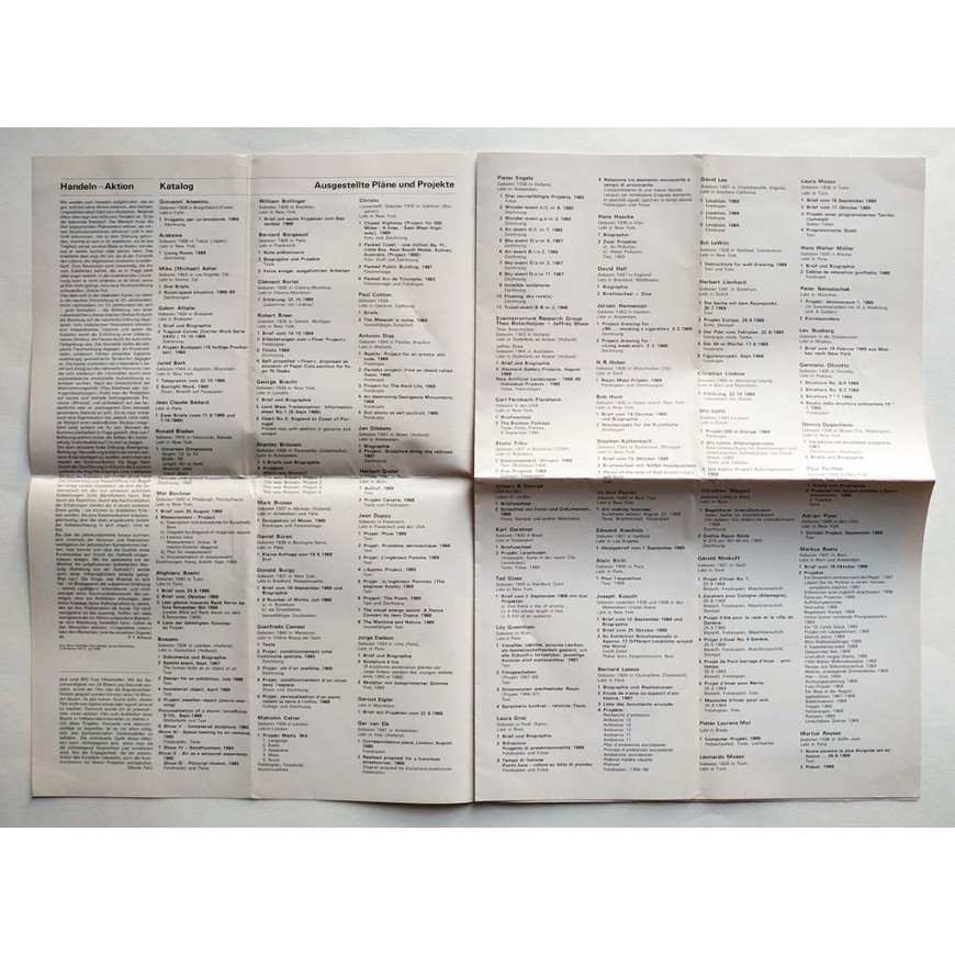 Publicación con formato periódico. Ilustraciones en b/n. Texto de P. F. Althaus (en alemán). Plegado en cuatro. Incluye la lista de artistas y obras expuestas (Giovanni Anselmo, Arakawa, Jared Bark, Alighiero Boetti, George Brecht, Stanley Brouwn, Daniel Büren, Christo, Antonio Dias, Jean Dupuy, Gilbert & George, Karl Gerstner, Lily Greenham, Joseph Kosuth, Sol LeWitt, Dennis Oppenheim, Adrian Piper, Lawrence Weiner, etc.). Buen estado