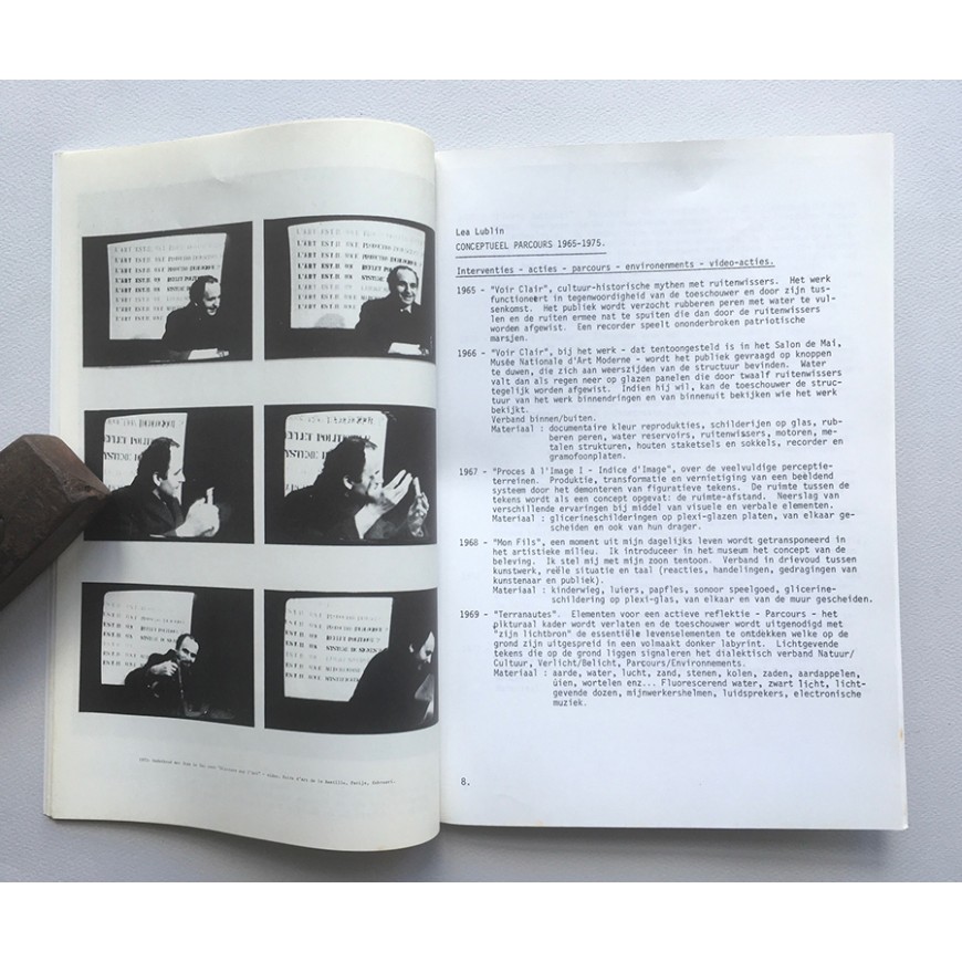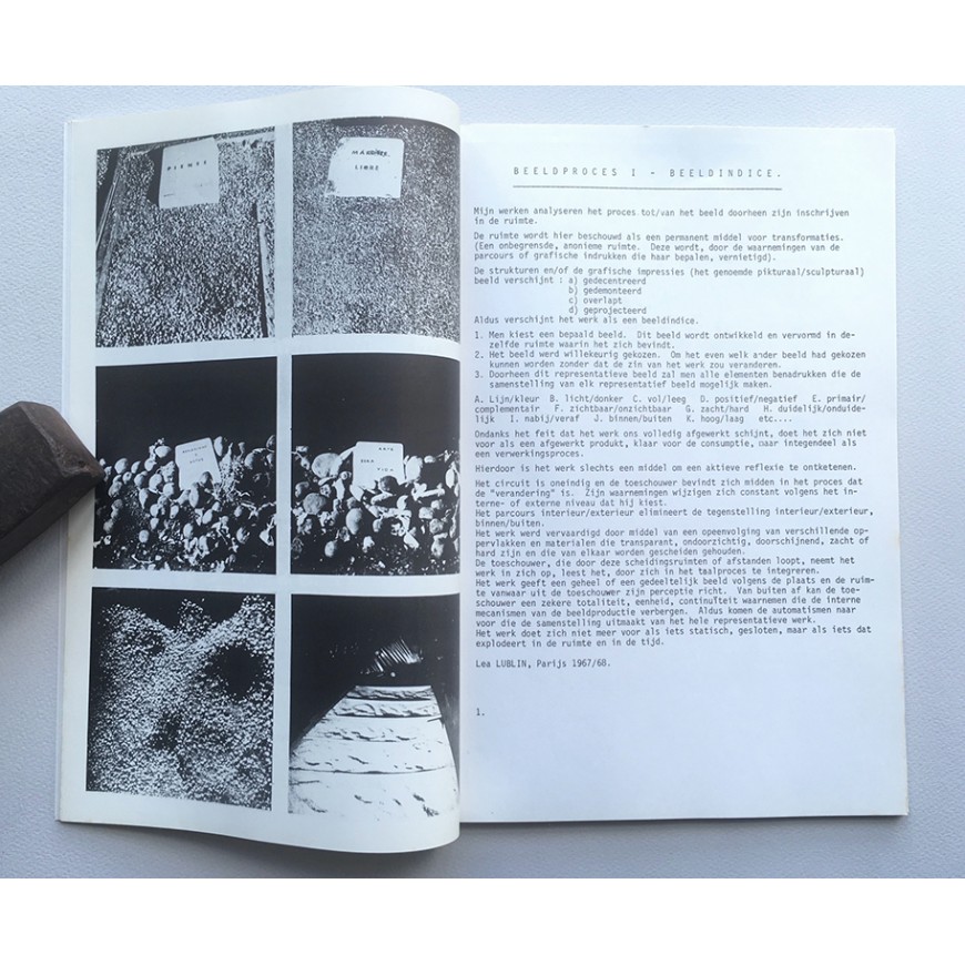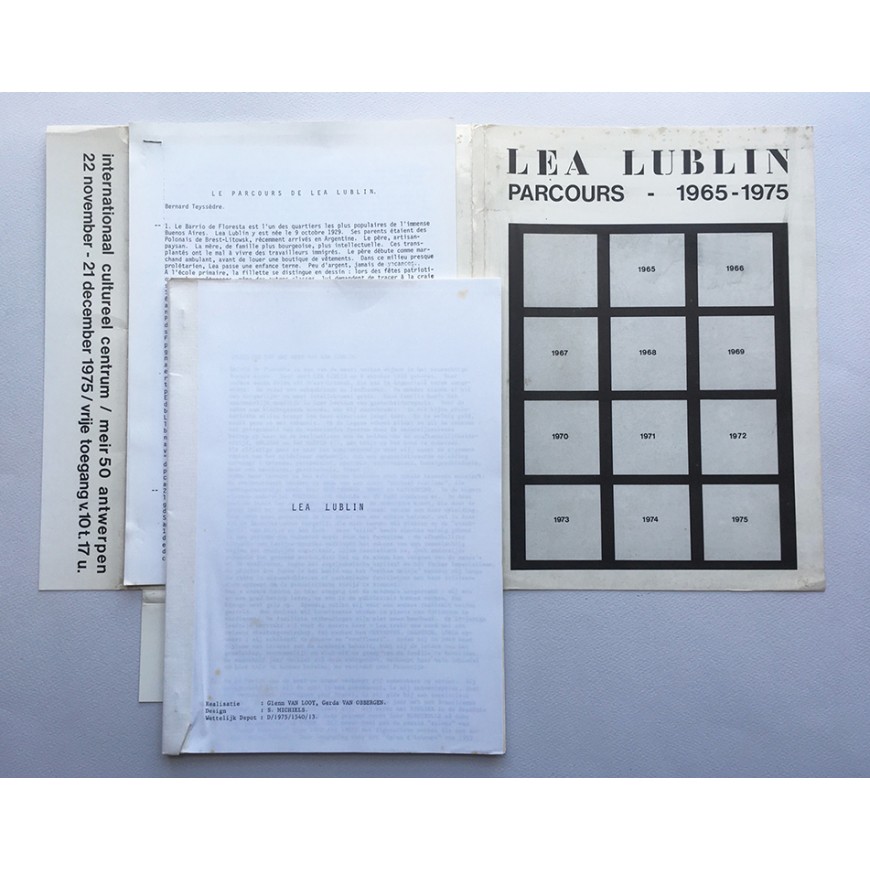 Catálogo de la exposición. Ilustraciones en b/n. Realización: Glenn van Looy, Gerda van Obbergen. Diseño: S. Michiels. Texto de Bernard Teyssèdre (en holandés). Adjunta documento del ICC compuesto por 12 hojas unidas con una grapa con el texto de Bernard Teyssèdre en francés ("Le parcours de Lea Lublin"). Todo en carpeta original impresa