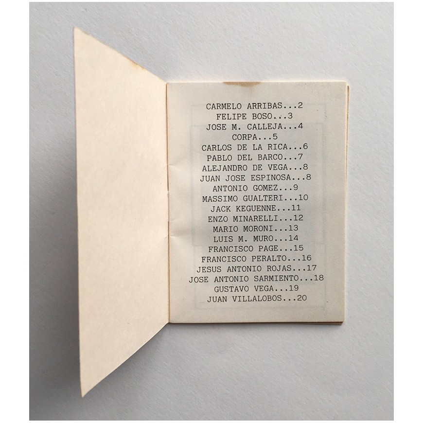 Catálogo de la exposición. Ilustraciones en b/n. Organiza: Antonio Gómez. Participaron Carmelo Arribas, Felipe Boso, José M. Calleja, Corpa, Carlos de la Rica, Pablo del Barco, Alejandro de Vega, Juan José Espinosa, Antonio Gómez, Massimo Gualteri, Jack Keguenne, Enzo Minarelli, Mario Moroni, Luis M. Muro, Francisco Page, Francisco Peralto, Jesús Antonio Rojas, José Antonio Sarmiento, Gustavo Vega y Juan Villalobos. Mancha en el borde superior de las hojas interiores, por lo demás buen estado