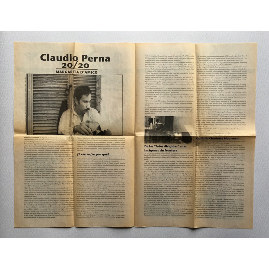 Publicación de la Fundación Claudio Perna para "conmemorar los primeros 20 años de inmortalidad del Maestro del Arte Conceptual Venezolano". Con formato periódico e ilustraciones en b/n. Texto de Margarita d'Amico acompañado de dos de los retratos que le hizo al artista. La portada y la última página ilustradas con dos fotografías de las series fotos dirigidas, con la participación de Gladys Uzcátegui. Incluye también un artículo sobre Charlotte Moorman, a la que Perna asistió, en la performance de Nam June Paik, en el Museo de Arte Contemporáneo de Caracas en abril de 1975. Plegado