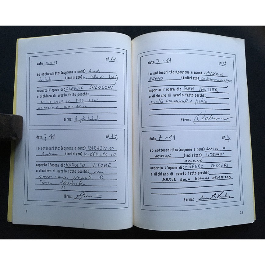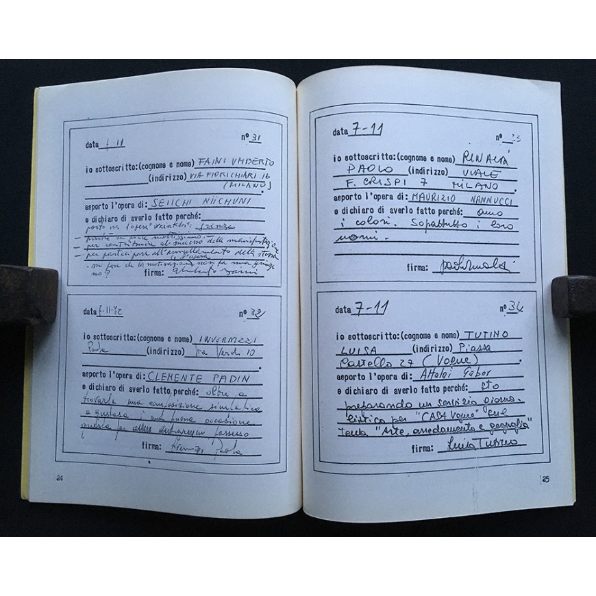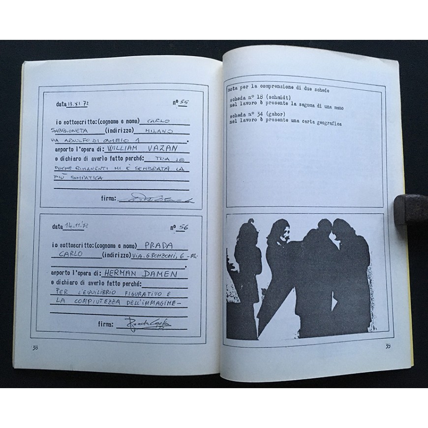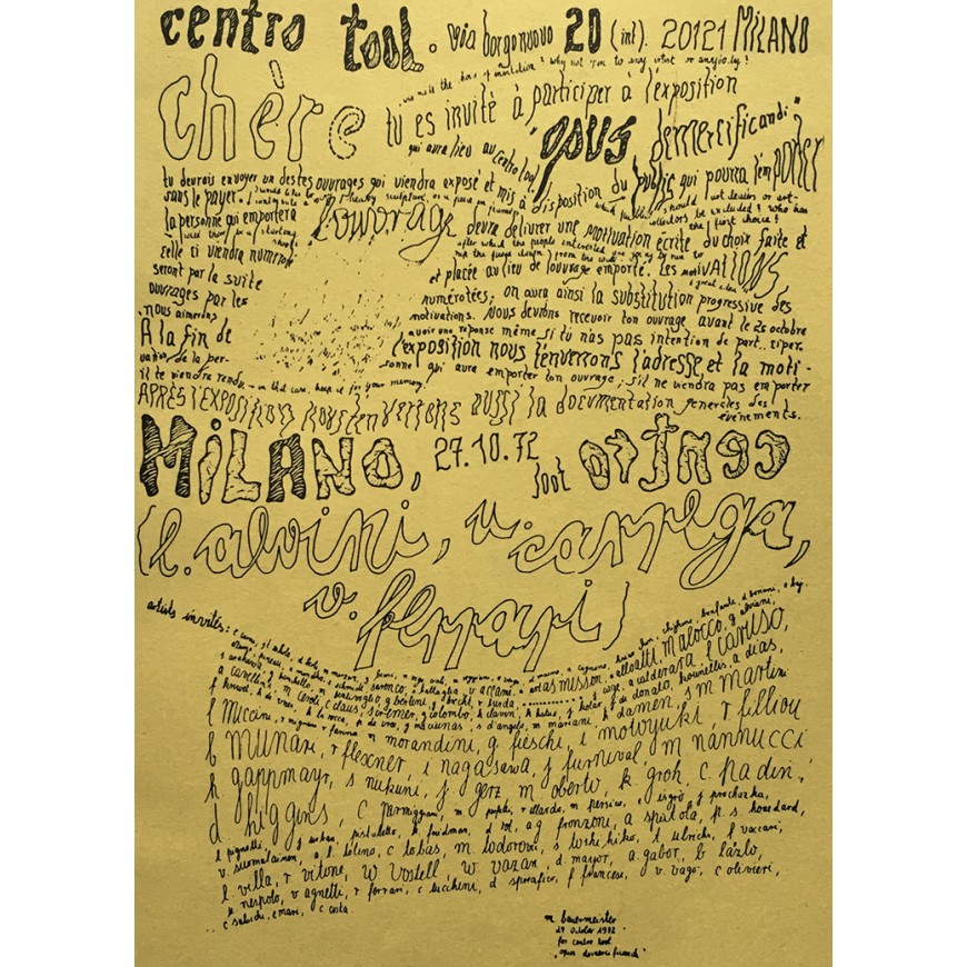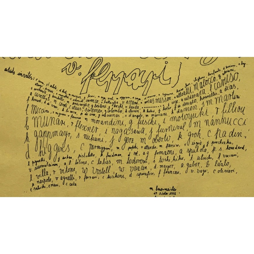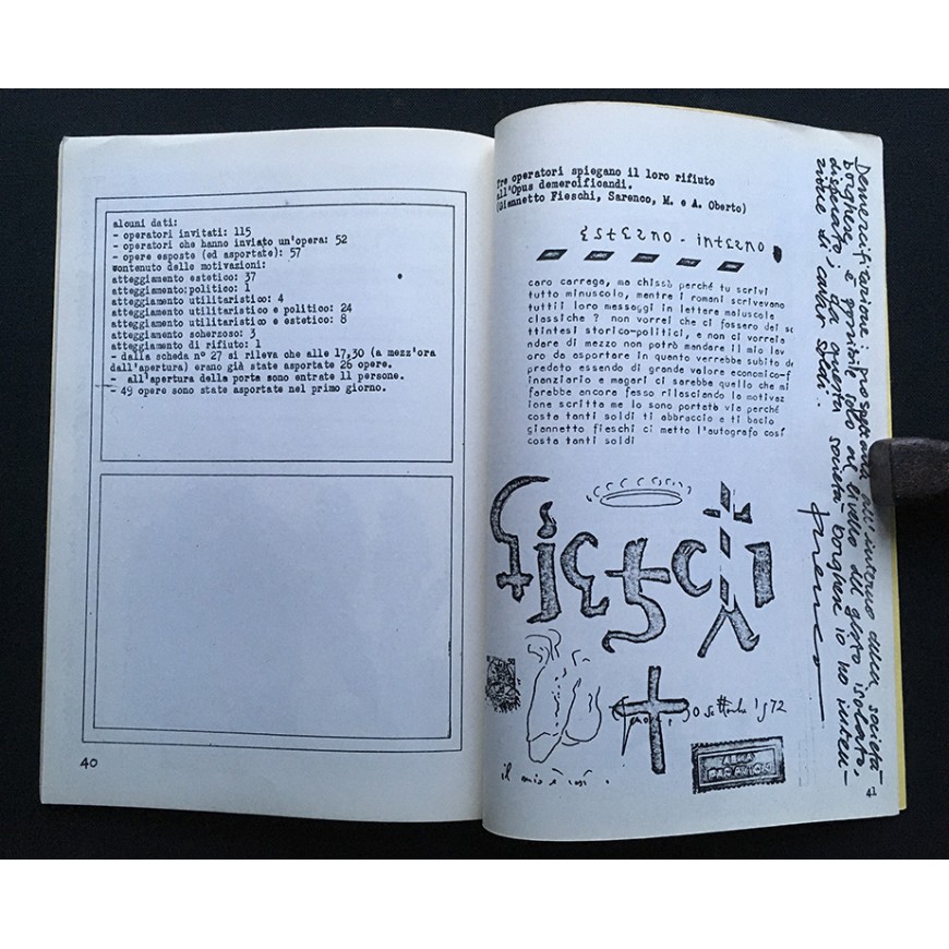 Catálogo de la exposición, en la que se exhibieron 56 obras enviadas gratuitamente por una cincuentena de artistas, entre ellos, Ugo Carrega, John Cage, George Maciunas, Jirí Kolár, Bruno Munari, Jannis Kounellis, Antonio Dias, Dick Higgins, John Furnival, Emilio Isgrò, Mary Bauermeister, Jochen Gerz, Arias Misson, Timm Ulrichs, Diter Rot [Dieter Roth], Annalisa Alloatti, Achille Cavellini, Ketty La Rocca, Janos Urban, Rodolfo Vitone, Ben Vautier, Franco Vaccari, Gianfranco Baruchello, Wolf Vostell, Klaus Groh, Antonio Calderara, Takahashi Shohachiro, Luciano Caruso, Kitasono Katuè, Miroljub Todorovi, Clemente Padín, Maurizio Nannucci, Adriano Spatola, Mirella Bentivoglio, Eugenio Miccini, Hans Clavin, Lamberto Pignotti, Rolando Mignani, Ken Friedman, Herman Damen, Giannetto Fieschi, Sarenco, ...