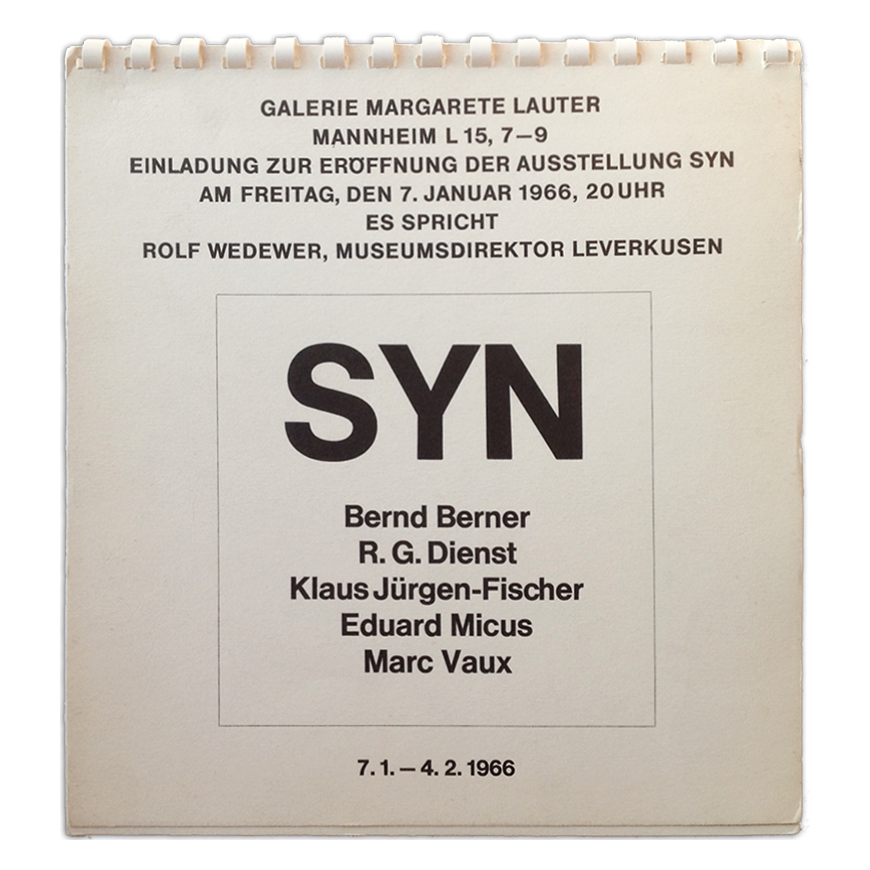 Syn: Bernd Berner, R. G. Dienst, Klaus Jürgen-Fischer, Eduard Micus, Marc Vaux. Galerie Margarete Lauter, Mannheim, 1966