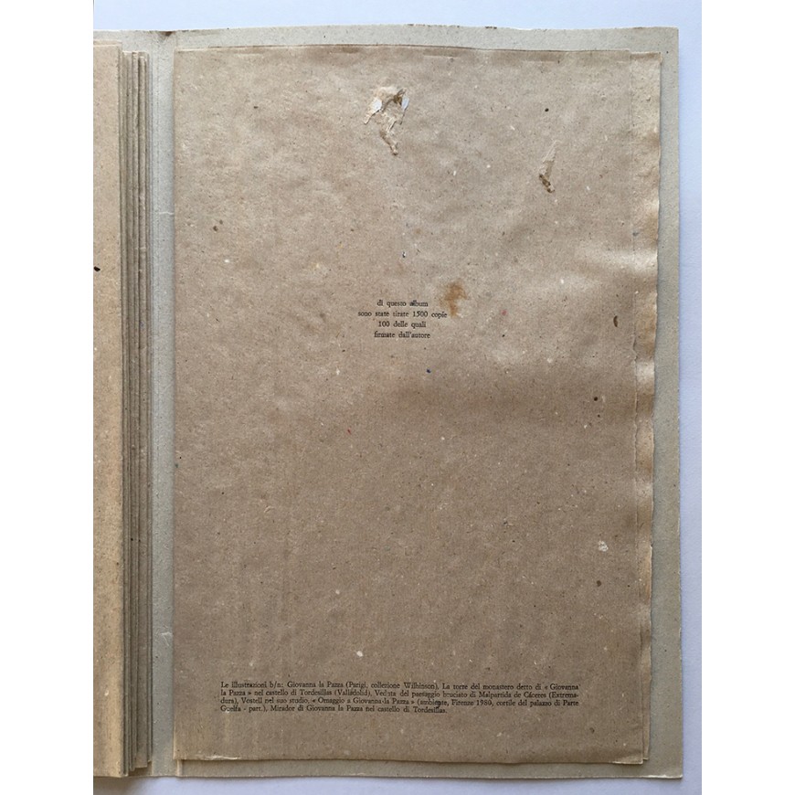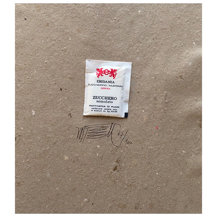 Catálogo de la exposición ilustrado con 16 láminas sobrepuestas (fotografías en b/n y reproducciones en color de los trabajos). Texto de Annette Malochet (en italiano). Libro de artista con un tiraje limitado de 1500 ejemplares, 100 de los cuales firmados y numerados por Vostell. Este que ofrecemos aquí uno de los 100 firmados (67/100), con un sobre de azúcar sobrepuesto sobre la firma
