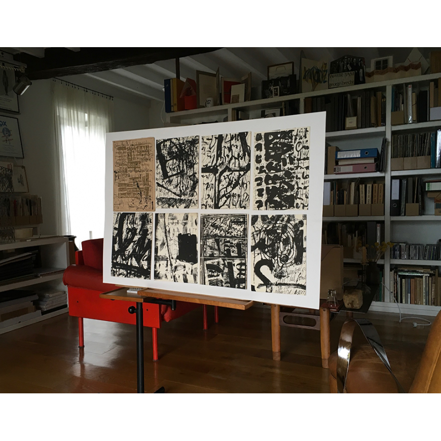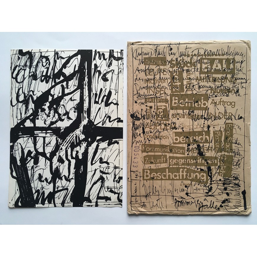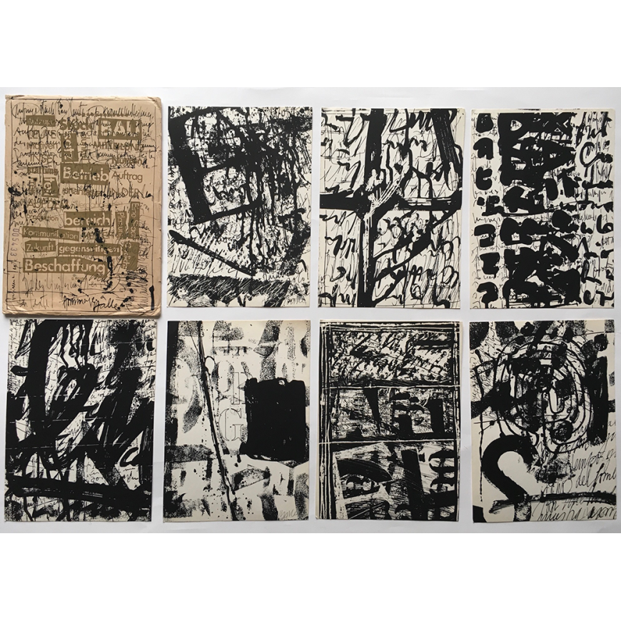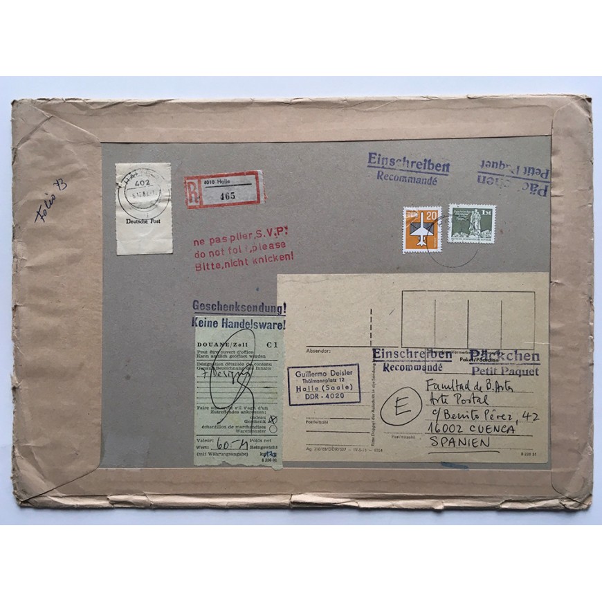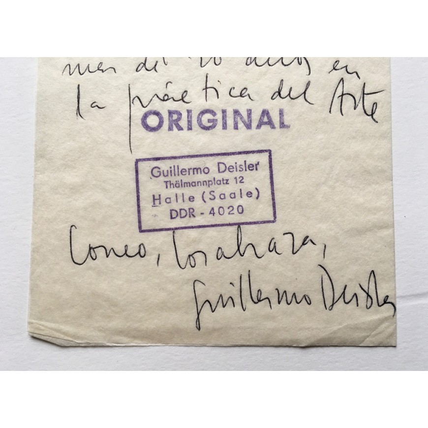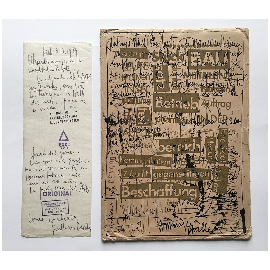 Trabajo compuesto por 7 serigrafías sobre cartulina, todas ellas firmadas a lápiz por Guillermo Deisler. Contenidas en sobre original también serigrafiado, con varios sellos postales y dirigido a la Facultad de Bellas Artes de Cuenca (la dirección escrita a mano). Deisler adjuntó también una nota manuscrita y con varios sellos de tinta dirigida a los organizadores de la muestra de arte postal a la que contribuía con este trabajo. El sobre fue matasellado en Halle en diciembre de 1989 (el trabajo es un homenaje a esta ciudad alemana en la que residía)